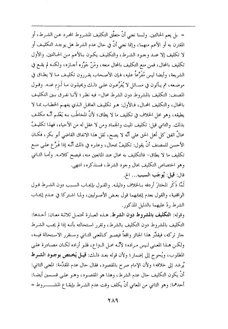 = بل يعم الحالتين. ولسنا نعني أنّ متعلَّق التكليف المشروط المجرد عن الشرط، أو المقترن به أو الأعم منهما، وإنما نعني أنَّ في حال عدم الشرط هل يوجد التكليف أو لا تكليف إلا عند وجود الشرط، والتكليف يكون بالأعم من الحالتين. والأول تكليف بالمحال، فمن منع التكليف بالمحال منعه، ومَنْ جَوَّزه أجازه، ولكنه لم يقع في الشريعة، وأيضًا ليس مُفَرَّعًا عليه، فإن الأصحاب يقررون تكليف ما لا يطاق في موضعه، ثم يأتون في مسائل لا يُفَرِّعون على ذلك ويحيلون ما لَزِم عنه. وقول المصنف: التكليف بالمشروط دون الشرط محال - فيه نظر؛ لأنا نفرق بين التكليف بالمحال، والتكليف المحال، فالأول: هو تكليف العاقل الذي يفهم الخطاب بما لا يطيقه، وهو محل الخلاف في تكليف ما لا يطاق؛ لأنَّ المخاطَب به يَعْلم أنَّه مكلف بذلك. والثاني قيل: تكليف الميت والجماد ومن لا عقل له من الأحياء، فهذا تكليفٌ محالٌ اتفق كل أهل الحق على أنَّه لا يصح، نَقل هذا الاتفاق القاضي أبو بكر، فكان الأحسن للمصنف أنْ يقول: تكليفٌ بمحال، وعذره في ذلك أنَّه إذا فَرَّع على منع تكليف ما لا يطاق - فالتكليف به محال عند المانعين منه، فيصح كلامه. وأما الثاني وهو اختصاص التكليف بحال وجود الشرط، فسنذكره، انتهى.