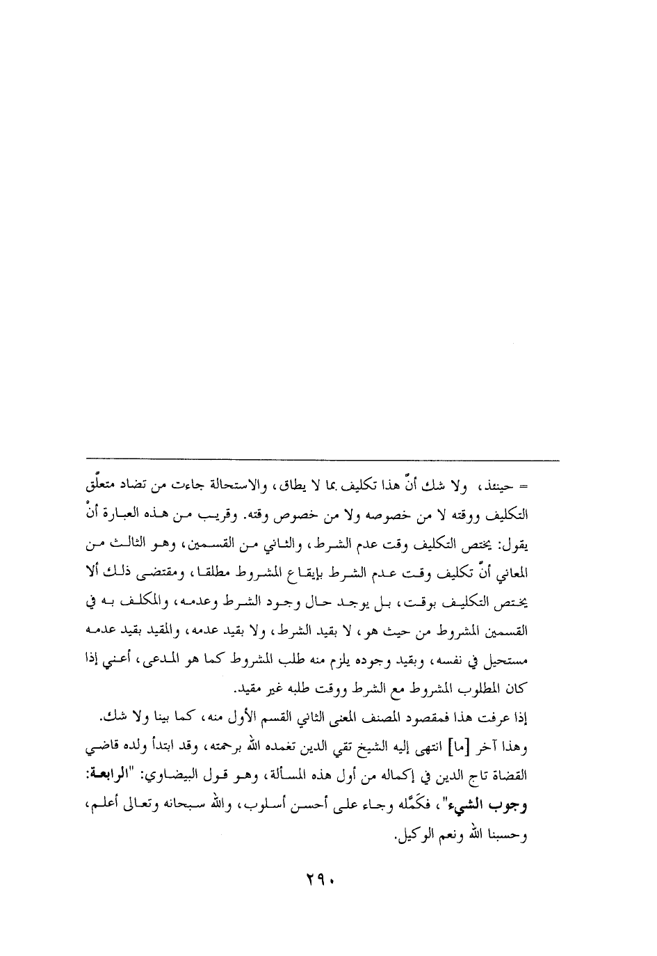 إذا عرفت هذا فمقصود المصنف المعنى الثاني القسم الأول منه، كما بينا ولا شك. وهذا آخر [ما] انتهى إليه الشيخ تقي الدين تغمده الله برحمته، وقد ابتدأ ولده قاضي القضاة تاج الدين في إكماله من أول هذه المسألة، وهو قول البيضاوي: "الرابعة: وجوب الشيء"، فكَمَّله وجاء على أحسن أسلوب، والله سبحانه وتعالى أعلم، وحسبنا الله ونعم الوكيل.