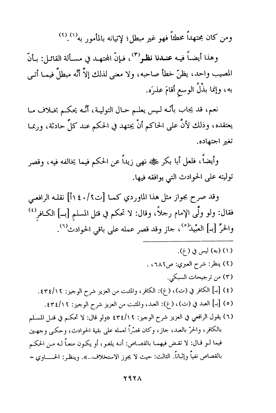 (¬٦) يقول الرافعي في العزيز شرح الوجيز: ١٢/ ٤٣٤ "ولو قال: لا تحكم في قتل المسلم بالكافر، والحرّ بالعبد، جاز، وكان قصْرًا لعمله على بقية الحوادث، وحكى وجهين فيما لو قال: لا تقض فيهما بالقصاص: أنه يلغو، أو يكون منعًا له من الحكم بالقصاص نفيًا وإثباتًا. الثالث: حيث لا يجوز الاستخلاف. . .". وينظر: الحاوي =