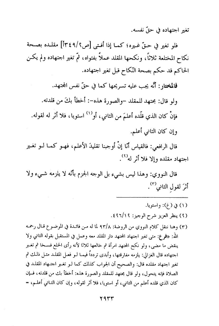 (¬٣) وهنا ننقل كلام النووي من الروضة: ٨/ ٩٣ لما له من فائدة في الموضوع قال رحمه الله: "فرع: متى تغير اجتهاد المجتهد دار المقلد معه وعمل في المستقبل بقوله الثاني ولا ينقض ما مضى، ولو نكح المجتهد امرأة ثم خالعها ثلاثا لأنه رأى الخلع فسخا ثم تغير اجتهاده قال الغزالي: يلزمه مفارقتها، وأبدى ترددًا فيما لو فعل المقلد مثل ذلك ضم تغير اجتهاد مقلده قال: والصحيح أن الجواب كذلك كما لو تغير اجتهاد المقلد في الصلاة فإنه يتحول، ولو قال مجتهد للمقلد والصورة هذه: أخطأ بك من قلدته، فإن كان الذي قلده أعلم من الثاني، أو استويا، فلا أثر لقوله، وإن كان الثاني أعلم، =