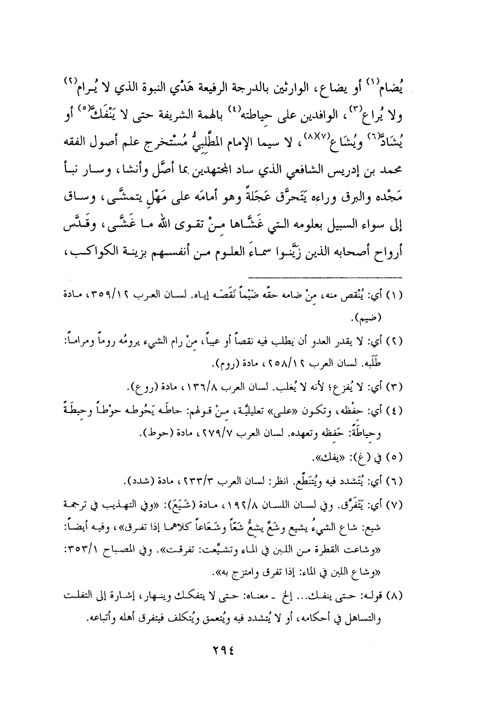 يُضام (¬١) أو يضاع، الوارثين بالدرجة الرفيعة هَدْي النبوة الذي لا يُرام (¬٢) ولا يُراع (¬٣)، الوافدين على حِياطته (¬٤) بالهمة الشريفة حتى لا يَنْفَكَّ (¬٥) أو يُشَادَّ (¬٦) ويُشَاع (¬٧) (¬٨)، لا سيما الإمام المطَّلِبِيُّ مُسْتخرج علم أصول الفقه محمد بن إدريس الشافعي الذي ساد المجتهدين بما أصَّل وأنشا، وسار نبأ مَجْده والبرق وراءه يَتَحرَّق عَجَلةً وهو أمامَه على مَهْلِ يتمشَّى، وساق إلى سواء السبيل بعلومه التي غَشَّاها مِنْ تقوى الله ما غَشَّى، وقَدَّس أرواح أصحابه الذين زَيَّنوا سماءَ العلوم من أنفسهم بزينة الكواكب،