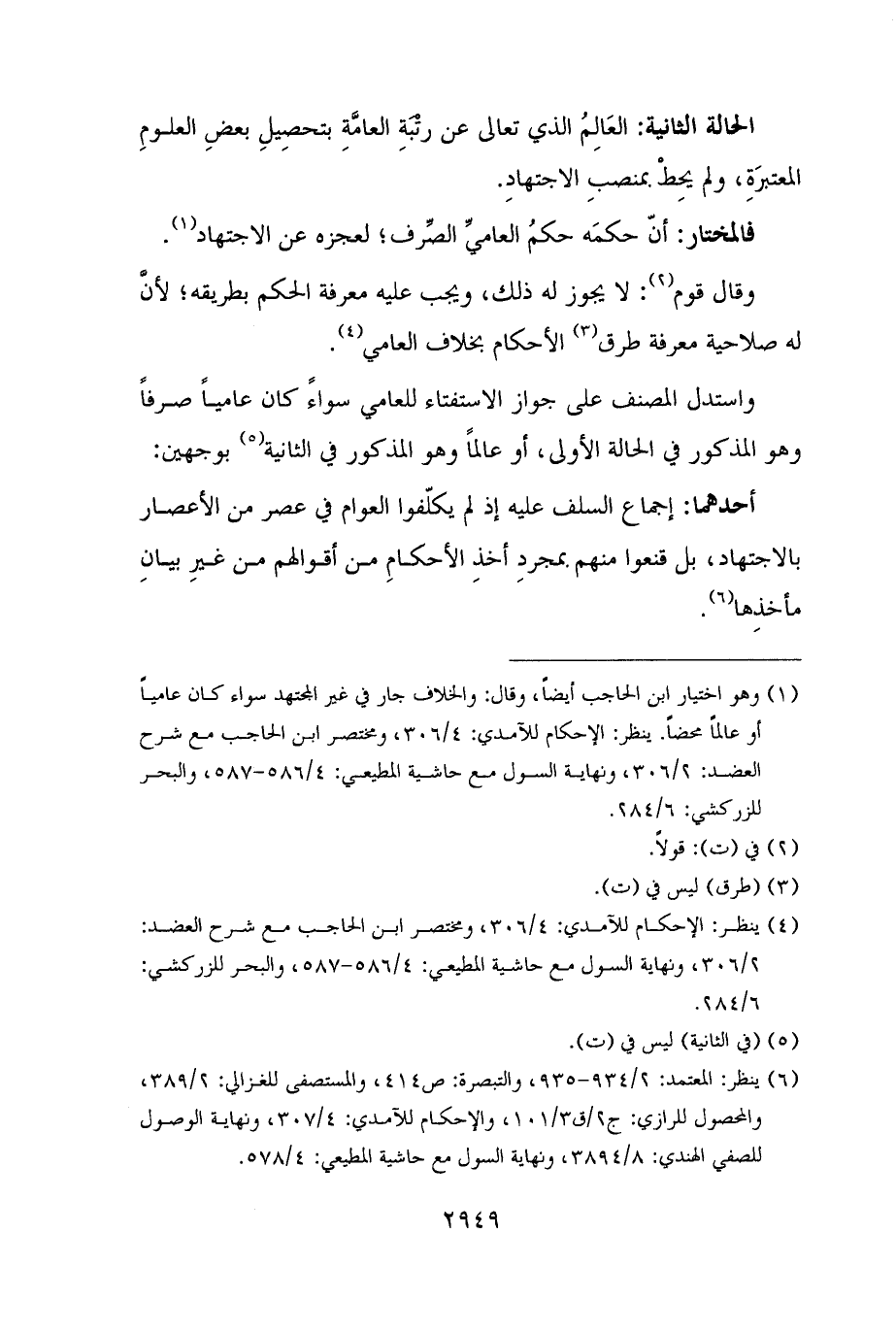 الحالة الثانية: العَالِمُ الذي تعالى عن رتْبَةِ العامَّةِ بتحصِيلِ بعضِ العلومِ المعتبرَةِ، ولم يحِطْ بمنصبِ الاجتهادِ.
