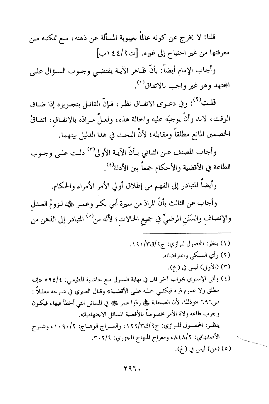 (¬٤) وأتى الإسنوي بجواب آخر قال في نهاية السول مع حاشية المطيعي: ٤/ ٥٩٤ "إنه مطلق ولا عموم فيه فيكفي حمله على الأقضية" وقال العبري في شرحه معللًا: ص ٦٩٦ "وذلك لأن الصحابة - رضي الله عنهم - ردّوا عمر - رضي الله عنه - في المسائل التي أخطأ فيها، فيكون وجوب طاعة ولاة الأمر مخصوصًا بالأقضية المسائل الاجتهادية".