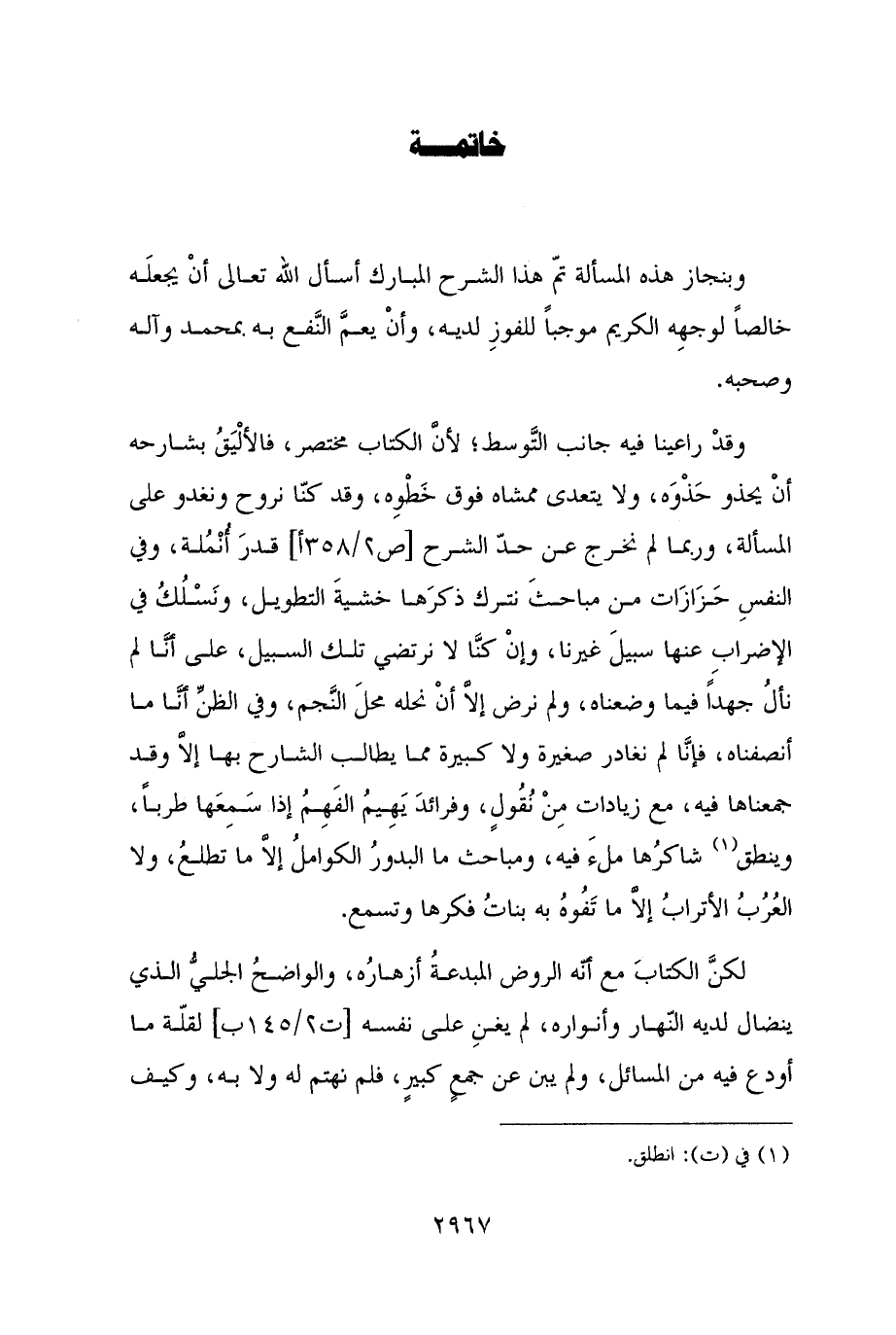 وبنجاز هذه المسألة تمّ هذا الشرح المبارك أسأل الله تعالى أنْ يجعلَه خالصًا لوجهِه الكريم موجبًا للفوزِ لديه، وأنْ يعمَّ النَّفع به بمحمد وآله وصحبه.