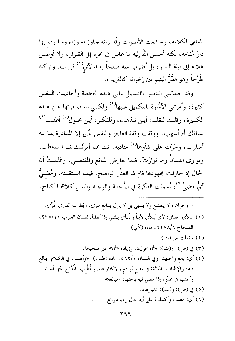 وقد حدثتني النفس بالتذييل على هذه القطعة وأحاديث النفس كثيرة، وأمرتني الأمَّارة بالتكميل عليها (¬٢) ولكني استصغرتها عن هذه الكبيرة، وقلت للقلم: أين تذهب، وللفكر: أين تحول (¬٣) أطنب (¬٤) لسانك أم أسهب، ووقفت وقفة العاجز والنفس تأبى إلا المبادرة بما به أشارت، وجَرَت على شأوها (¬٥) منادية: ائت مما أمرتُك بما استطعت. وتوارى اللسانُ وما توارَتْ، فلما تعارض المانع والمقتضي، وعَلمتُ أن الحال إذ حاولت مجهودها قام لها العُذر الواضح، فيما استقبلتْه، ومُضِيٌّ أىُّ مضيٍّ (¬٦)، أعملت الفكرة في الدُّجنة والوجه والليل كلاهما كالح،