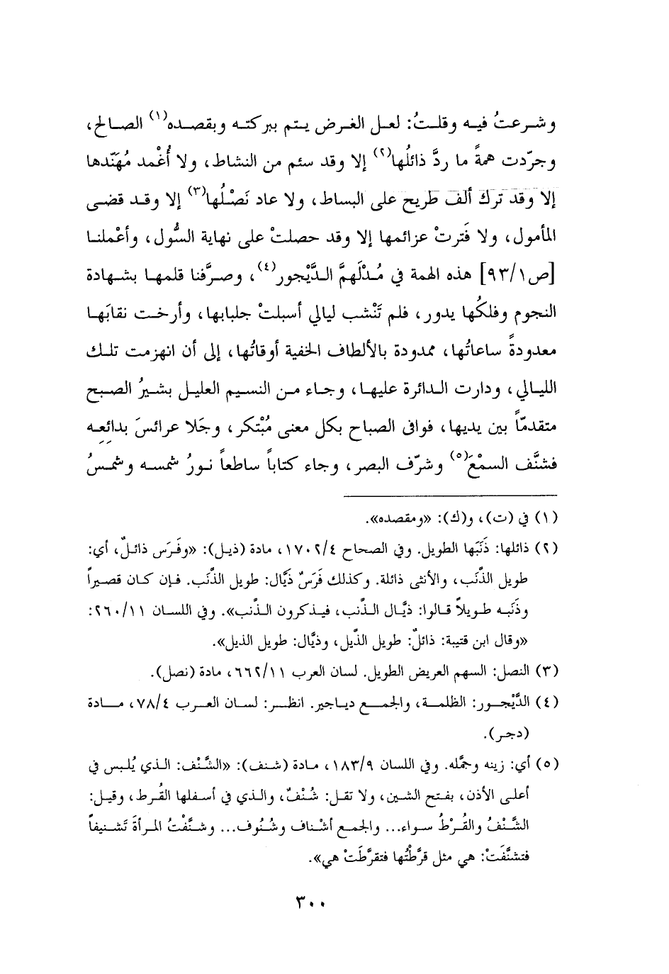 وشرعتُ فيه وقلتُ: لعل الغرض يتم ببركته وبقصده (¬١) الصالح، وجرّدت همةً ما ردَّ ذائلُها (¬٢) إلا وقد سئم من النشاط، ولا أُغْمد مُهَنّدها إلا وقد ترك ألف طريح على البساط، ولا عاد نَصْلُها (¬٣) إلا وقد قضى المأمول، ولا فَترتْ عزائمها إلا وقد حصلتْ على نهاية السُّول، وأعْملنا هذه الهمة في مُدْلَهمَّ الدَّيْجور (¬٤)، وصرَّفنا قلمها بشهادة النجوم وفلكُها يدور، فلم تَنْشب ليالي أسبلتْ جلبابها، وأرخت نقابَها معدودةً ساعاتُها، ممدودة بالألطاف الخفية أوقاتُها، إلى أن انهزمت تلك الليالي، ودارت الدائرة عليها، وجاء من النسيم العليل بشيرُ الصبح متقدمًّا بين يديها، فوافى الصباح بكل معنى مُبْتكر، وجَلا عرائسَ بدائِعِه فشنَّف السمْعَ (¬٥) وشرّف البصر، وجاء كتابًا ساطعًا نورُ شمسه وشمسُ