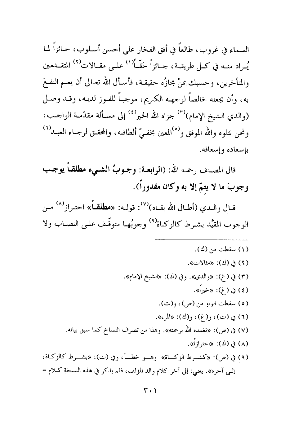 السماء في غروب، طالعًا في أفق الفخار على أحسن أسلوب، حائزًا لما يُراد منه في كل طريقة، جائزًا حَقًّا (¬١) على مقالات (¬٢) المتقدمين والمتأخرين، وحسبك بمنْ مجازُه حقيقة، فأسأل الله تعالى أن يعم النفعَ به، وأن يجعله خالصًا لوجهه الكريم، موجبًا للفوز لديه، وقد وصل (والدي الشيخ الإمام) (¬٣) جزاه الله الخير (¬٤) إلى مسألة مقدّمة الواجب، ونحن نتلوه والله الموفق و (¬٥) المعين بخفيّ ألطافه، والمحقق لرجاء العبد (¬٦) بإسعاده وإسعافه.