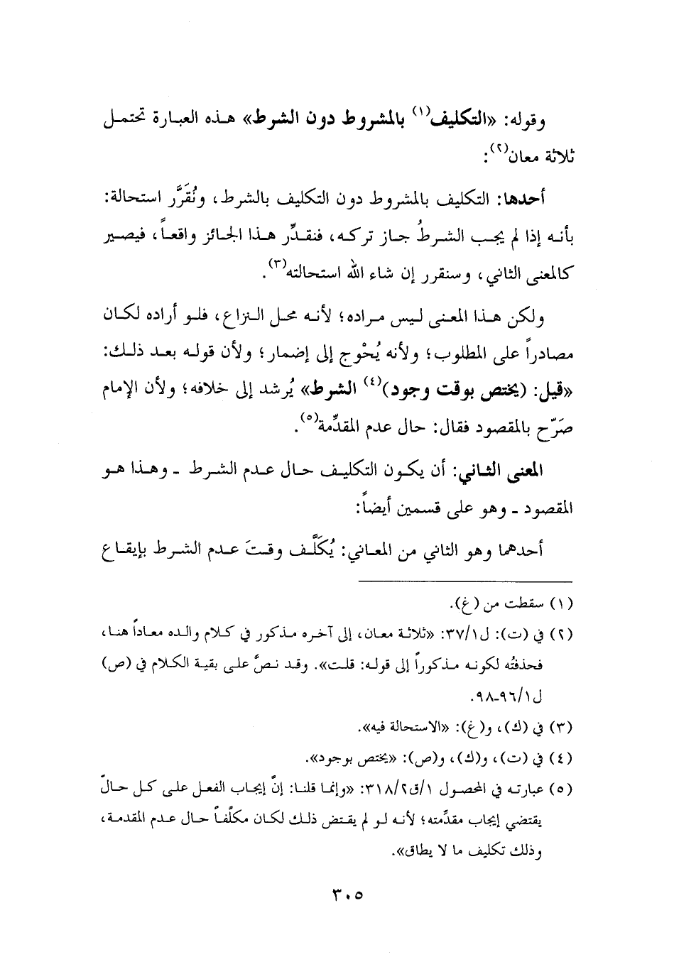 أحدها: التكليف بالمشروط دون التكليف بالشرط، ونُقَرَّر استحالة: بأنه إذا لم يجب الشرطُ جاز تركه، فنقدِّر هذا الجائز واقعًا، فيصير كالمعنى الثاني، وسنقرر إن شاء الله استحالته (¬٣).
