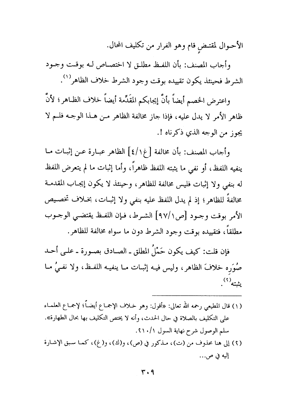 وأجاب المصنف: بأن مخالفة الظاهر عبارة عن إثبات ما ينفيه اللفظ، أو نفي ما يثبته اللفظ ظاهرًا، وأما إثبات ما لم يتعرض اللفظ له بنفي ولا إثبات فليس مخالفة للظاهر، وحينئذ لا يكون إيجاب المقدمة مخالفةً للظاهر؛ إذ لم يدل اللفظ عليه بنفي ولا إثبات، بخلاف تخصيص الأمر بوقت وجود الشرط، فإن اللفظ يقتضي الوجوب مطلقًا، فتقييده بوقت وجود الشرط دون ما سواه مخالفة للظاهر.