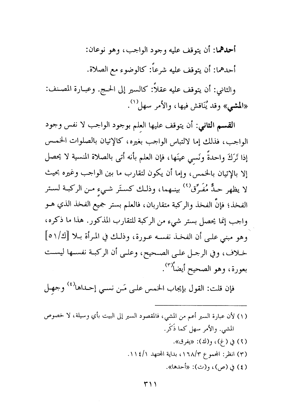 القسم الثاني: أن يتوقف عليها العِلم بوجود الواجب لا نفس وجود الواجب، فذلك إما لالتباس الواجب بغيره، كالإتيان بالصلوات الخمس إذا تَرَكَ واحدةً ونَسِي عينَها، فإن العلم بأنه أتى بالصلاة المنسية لا يحصل إلا بالإتيان بالخمس، وإما أن يكون لتقارب ما بين الواجب وغيره بحيث لا يظهر حدٌّ مُفَرِّق (¬٢) بينهما، وذلك كستَر شيءٍ من الركبة لستر الفخذ؛ فإنَّ الفخذ والركبة متقاربان، فالعلم بستر جميع الفخذ الذي هو واجب إنما يحصل بستر شيء من الركبة للتقارب المذكور. هذا ما ذكره، وهو مبني على أن الفخذ نفسه عورة، وذلك في المرأة بلا خلاف، وفي الرجل على الصحيح، وعلى أن الركبة نفسها ليست بعورة، وهو الصحيح أيضًا (¬٣).