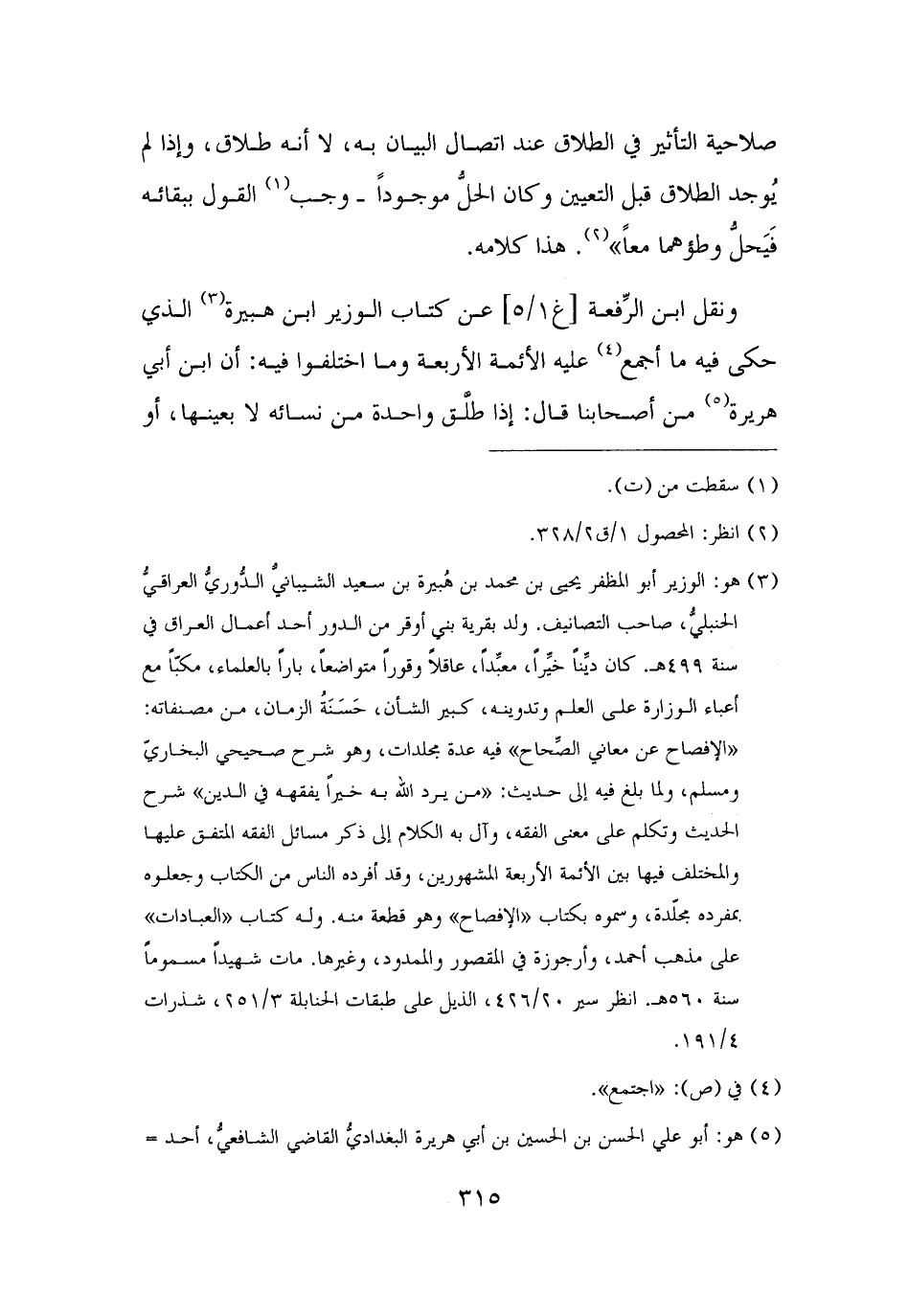 (¬٣) هو: الوزير أبو المظفر يحيى بن محمد بن هُبيرة بن سعيد الشيبانيُّ الدُّوريُّ العراقيُّ الحنبليُّ، صاحب التصانيف. ولد بقرية بني أوقر من الدور أحد أعمال العراق في سنة ٤٩٩ هـ. كان ديِّنًا خيِّرًا، معبِّدًا، عاقلًا وقورًا متواضعًا، بارًا بالعلماء، مكبًّا مع أعباء الوزارة على العلم وتدوينه، كبير الشأن، حَسَنَةُ الزمان، من مصنفاته: "الإفصاح عن معاني الصِّحاح" فيه عدة مجلدات، وهو شرح صحيحي البخاريّ ومسلم، ولما بلغ فيه إلى حديث: "من يرد الله به خيرًا يفقهه في الدين" شرح الحديث وتكلم على معنى الفقه، وآل به الكلام إلى ذكر مسائل الفقه المتفق عليها والمختلف فيها بين الأئمة الأربعة المشهورين، وقد أفرده الناس من الكتاب وجعلوه بمفرده مجلّدة، وسموه بكتاب "الإفصاح" وهو قطعة منه. وله كتاب "العبادات" على مذهب أحمد، وأرجوزة في المقصور والممدود، وغيرها. مات شهيدًا مسمومًا سنة ٥٦٠ هـ. انظر سير ٢٠/ ٤٢٦، الذيل على طبقات الحنابلة ٣/ ٢٥١، شذرات ٤/ ١٩١.