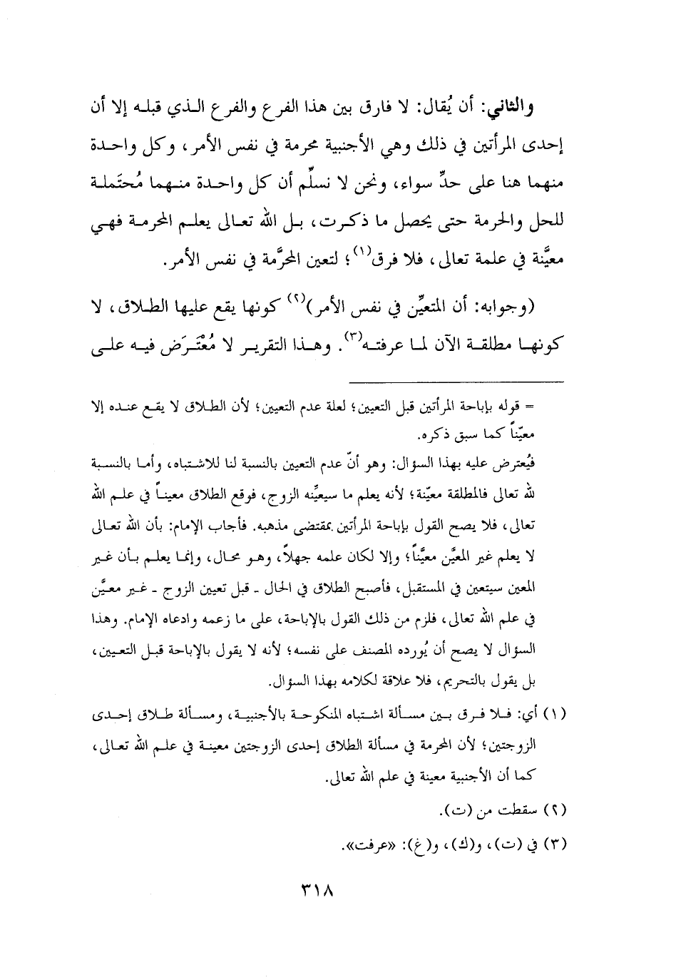 فيُعترض عليه بهذا السؤال: وهو أنّ عدم التعيين بالنسبة لنا للاشتباه، وأما بالنسبة لله تعالى فالمطلقة معيّنة؛ لأنه يعلم ما سيعيِّنه الزوج، فوقع الطلاق معينًا في علم الله تعالى، فلا يصح القول بإباحة المرأتين بمقتضى مذهبه. فأجاب الإمام: بأن الله تعالى لا يعلم غير المعيِّن معيَّنًا؛ وإلا لكان علمه جهلًا، وهو محال، وإنما يعلم بأن غير المعين سيتعين في المستقبل، فأصبح الطلاق في الحال - قبل تعيين الزوج - غير معيَّن في علم الله تعالى، فلزم من ذلك القول بالإباحة، على ما زعمه وادعاه الإمام. وهذا السؤال لا يصح أن يُورده المصنف على نفسه؛ لأنه لا يقول بالإباحة قبل التعيين، بل يقول بالتحريم، فلا علاقة لكلامه بهذا السؤال.