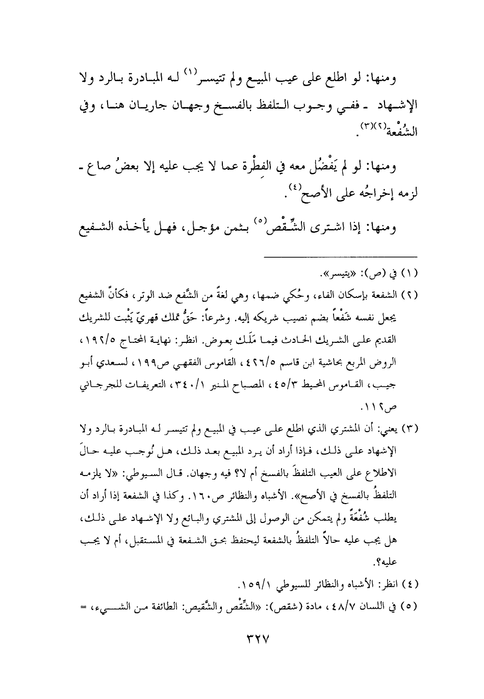 (¬٣) يعني: أن المشتري الذي اطلع على عيب في المبيع ولم تتيسر له المبادرة بالرد ولا الإشهاد على ذلك، فإذا أراد أن يرد المبيع بعد ذلك، هل نُوجب عليه حالَ الاطلاع على العيب التلفظَ بالفسخ أم لا؟ فيه وجهان. قال السيوطي: "لا يلزمه التلفظُ بالفسخ في الأصح". الأشباه والنظائر ص ١٦٠. وكذا في الشفعة إذا أراد أن يطلب شُفْعَةً ولم يتمكن من الوصول إلى المشتري والبائع ولا الإشهاد على ذلك، هل يجب عليه حالًا التلفظُ بالشفعة ليحتفظ بحق الشفعة في المستقبل، أم لا يجب عليه؟ .