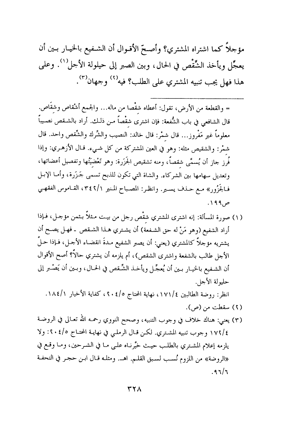 (¬٣) يعني: هناك خلاف في وجوب التنبيه، وصحح النووي رحمه الله تعالى في الروضة ٤/ ١٧٢ وجوب تنبيه المشتري. لكن قال الرملي في نهاية المحتاج ٥/ ٢٠٤: ولا يلزمه إعلام المشتري بالطلب حيث خيَّرناه على ما في الشرحين، وما وقع في "الروضة" من اللزوم نُسب لسبق القلم. اهـ. ومثله قال ابن حجر في التحفة ٦/ ٩٦.