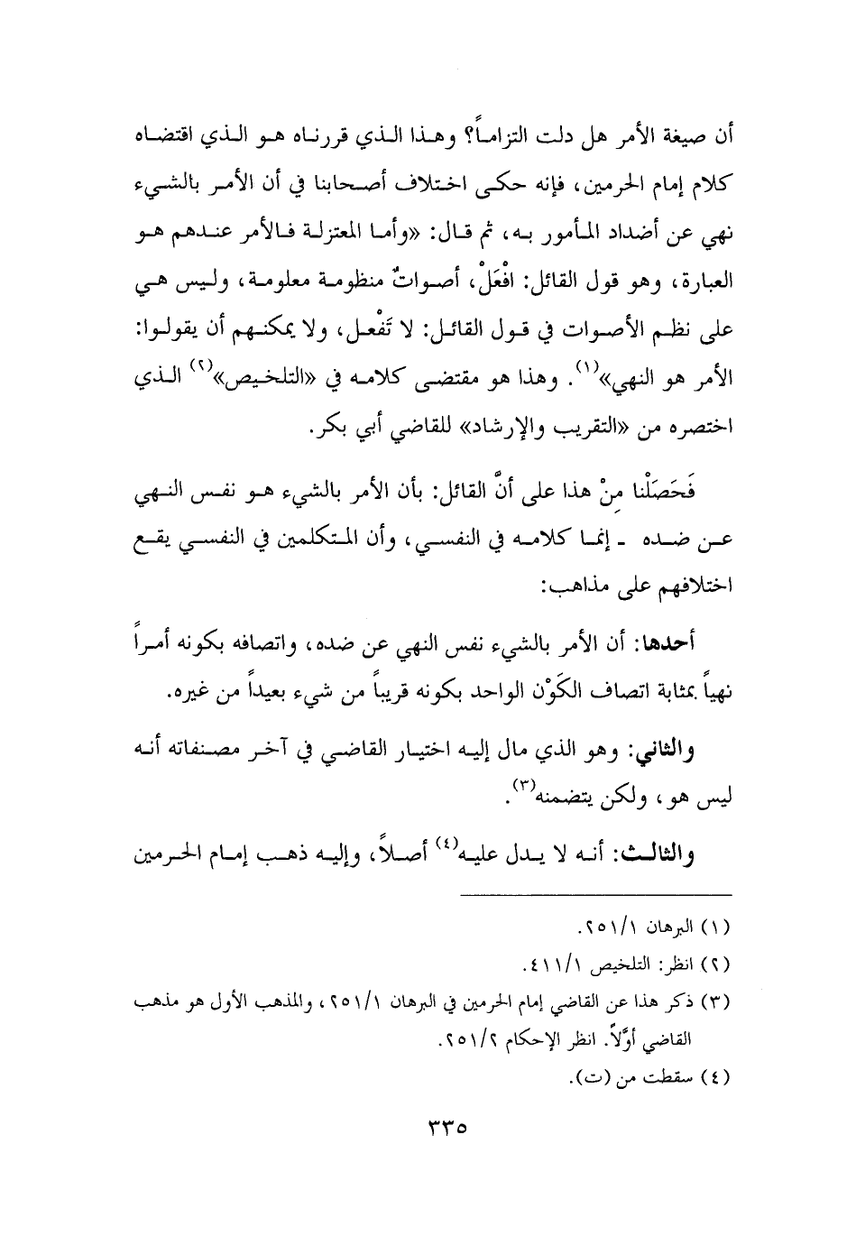أن صيغة الأمر هل دلت التزامًا؟ وهذا الذي قررناه هو الذي اقتضاه كلام إمام الحرمين، فإنه حكى اختلاف أصحابنا في أن الأمر بالشيء نهي عن أضداد المأمور به، ثم قال: "وأما المعتزلة فالأمر عندهم هو العبارة، وهو قول القائل: افْعَلْ، أصواتٌ منظومة معلومة، وليس هي على نظم الأصوات في قول القائل: لا تَفْعل، ولا يمكنهم أن يقولوا: الأمر هو النهي" (¬١). وهذا هو مقتضى كلامه في "التلخيص" (¬٢) الذي اختصره من "التقريب والإرشاد" للقاضي أبي بكر.