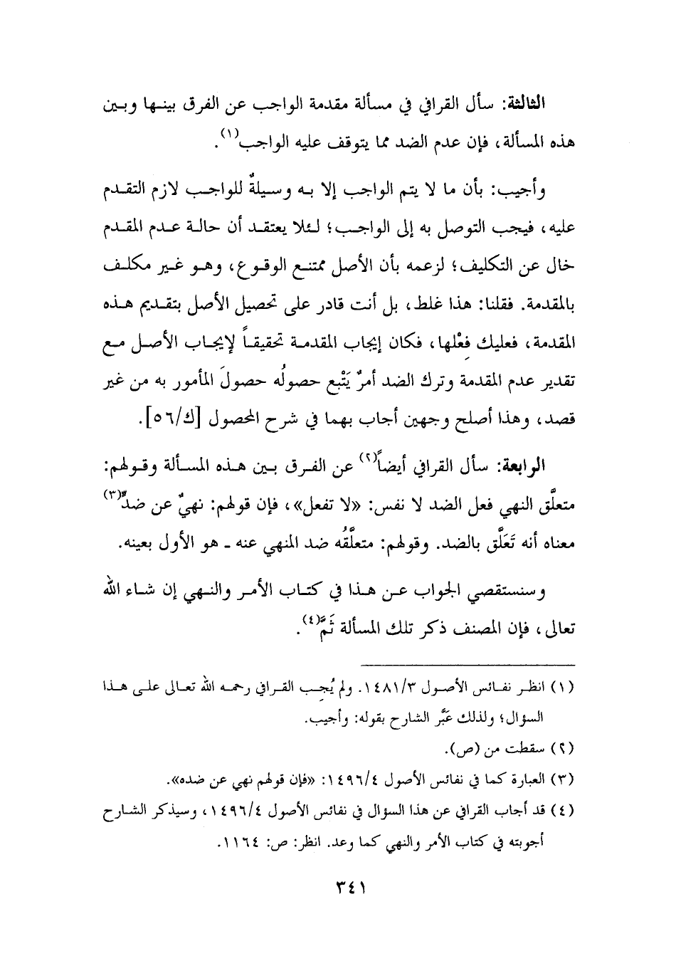 (¬٤) قد أجاب القرافي عن هذا السؤال في نفائس الأصول ٤/ ١٤٩٦، وسيذكر الشارح أجوبته في كتاب الأمر والنهي كما وعد. انظر: ص: ١١٦٤.