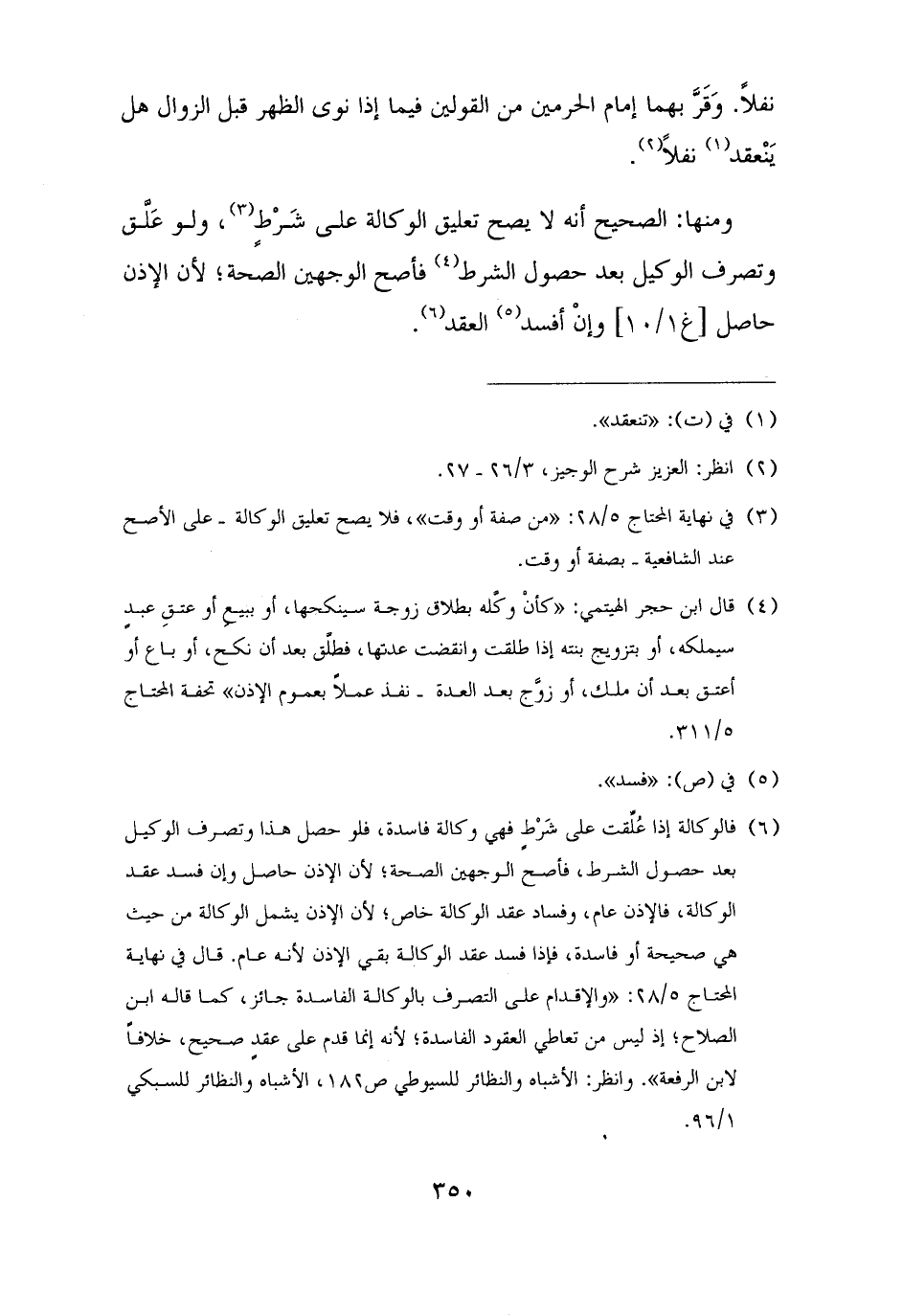 (¬٤) قال ابن حجر الهيتمي: "كأنْ وكَّله بطلاق زوجة سينكحها، أو ببيعٍ أو عتقِ عبدٍ سيملكه، أو بتزويج بنته إذا طلقت وانقضت عدتها، فطلَّق بعد أن نكح، أو باع أو أعتق بعد أن ملك، أو زوَّج بعد العدة - نفذ عملًا بعموم الإذن" تحفة المحتاج ٥/ ٣١١.