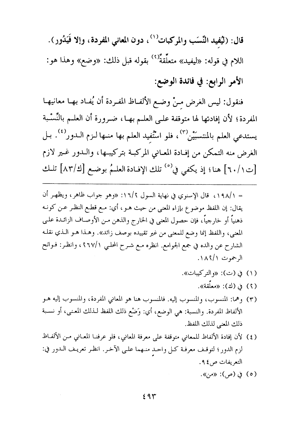 (¬٤) لأن إفادة الألفاظ للمعاني متوقفة على معرفة المعاني، فلو عرفنا المعاني من الألفاظ لزم الدور؛ لتوقف معرفة كل واحدٍ منهما على الآخر. انظر تعريف الدور في: التعريفات ص ٩٤.