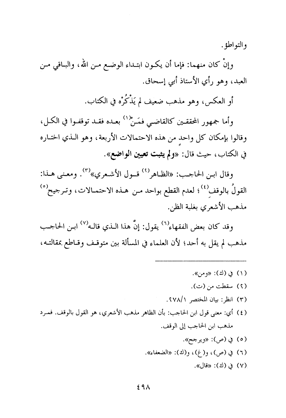 وقال ابن الحاجب: "الظاهر (¬٢) قول الأشعري" (¬٣). ومعنى هذا: القولُ بالوقفِ (¬٤)؛ لعدم القطع بواحد من هذه الاحتمالات، وترجيح (¬٥) مذهب الأشعري بغلبة الظن.