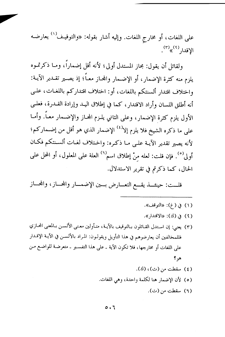 ولقائل أن يقول: مجاز المستدل أولى؛ لأنه أقل إضمارًا، وما ذكرتموه يلزم منه كثرة الإضمار، أو الإضمار والمجاز معًا؛ إذ يصير تقدير الآية: واختلاف اقتدار ألسنتكم باللغات، أو: اختلاف اقتداركم باللغات، على أنه أطلق اللسان وأراد الاقتدار، كما في إطلاق اليد وإرادة القدرة، فعلى الأول يلزم كثرة الإضمار، وعلى الثاني يلزم المجاز والإضمار معًا. وأما على ما ذكره الشيخ فلا يلزم إلا (¬٤) الإضمار الذي هو أقل من إضماركم؛ لأنه يصير تقدير الآية على ما ذكره: واختلاف لغات ألسنتكم فكان أولى (¬٥). فإن قلت: لعله مِنْ إطلاق اسم (¬٦) العلة على المعلول، أو المحل على الحال، كما ذكرتم في تقرير الاستدلال.