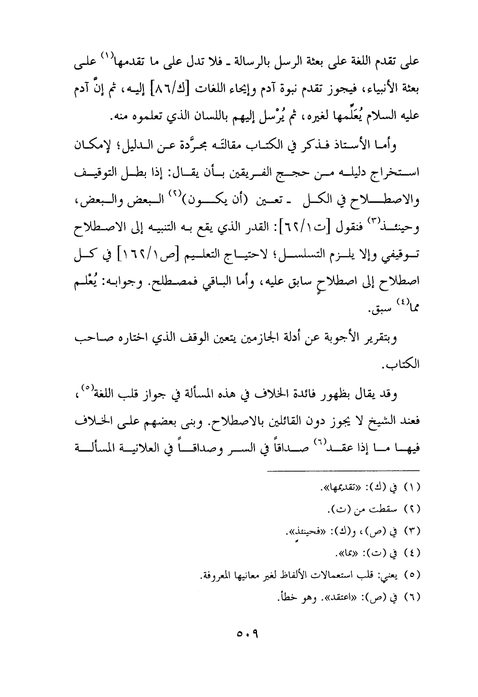 وأما الأستاذ فذكر في الكتاب مقالتَه مجرَّدة عن الدليل؛ لإمكان استخراج دليله من حجج الفريقين بأن يقال: إذا بطل التوقيف والاصطلاح في الكل - تعين (أن يكون) (¬٢) البعض والبعض، وحينئذ (¬٣) فنقول: القدر الذي يقع به التنبيه إلى الاصطلاح توقيفي وإلا يلزم التسلسل؛ لاحتياج التعليم في كل اصطلاح إلى اصطلاحٍ سابق عليه، وأما الباقي فمصطلح. وجوابه: يُعْلم مما (¬٤) سبق.