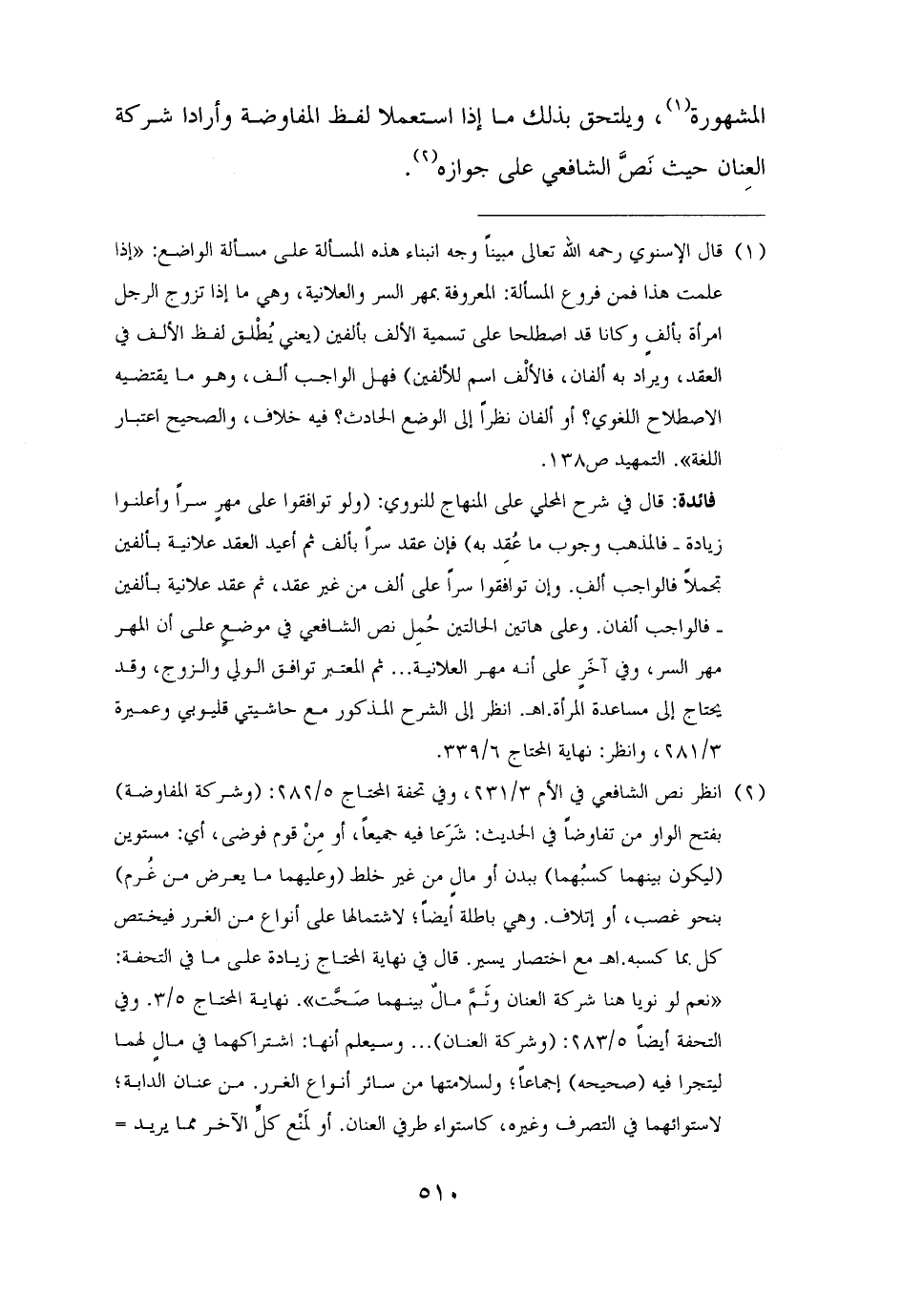 (¬٢) انظر نص الشافعي في الأم ٣/ ٢٣١، وفي تحفة المحتاج ٥/ ٢٨٢: (وشركة المفاوضة) بفتح الواو من تفاوضًا في الحديث: شَرَعا فيه جميعًا، أو مِنْ قوم فوضى، أي: مستوين (ليكون بينهما كسبُهما) ببدن أو مالٍ من غير خلط (وعليهما ما يعرض من غُرم) بنحو غصب، أو إتلاف. وهي باطلة أيضًا؛ لاشتمالها على أنواع من الغرر فيختص كل بما كسبه. اهـ مع اختصار يسير. قال في نهاية المحتاج زيادة على ما في التحفة: "نعم لو نويا هنا شركة العنان وثَمَّ مالٌ بينهما صَحَّت". نهاية المحتاج ٥/ ٣. وفي التحفة أيضًا ٥/ ٢٨٣: (وشركة العنان). . . وسيعلم أنها: اشتراكهما في مالٍ لهما ليتجرا فيه (صحيحه) إجماعًا؛ ولسلامتها من سائر أنواع الغرر. من عنان الدابة؛ لاستوائهما في التصرف وغيره، كاستواء طرفي العنان. أو لمَنْع كلِّ الآخر مما يريد =