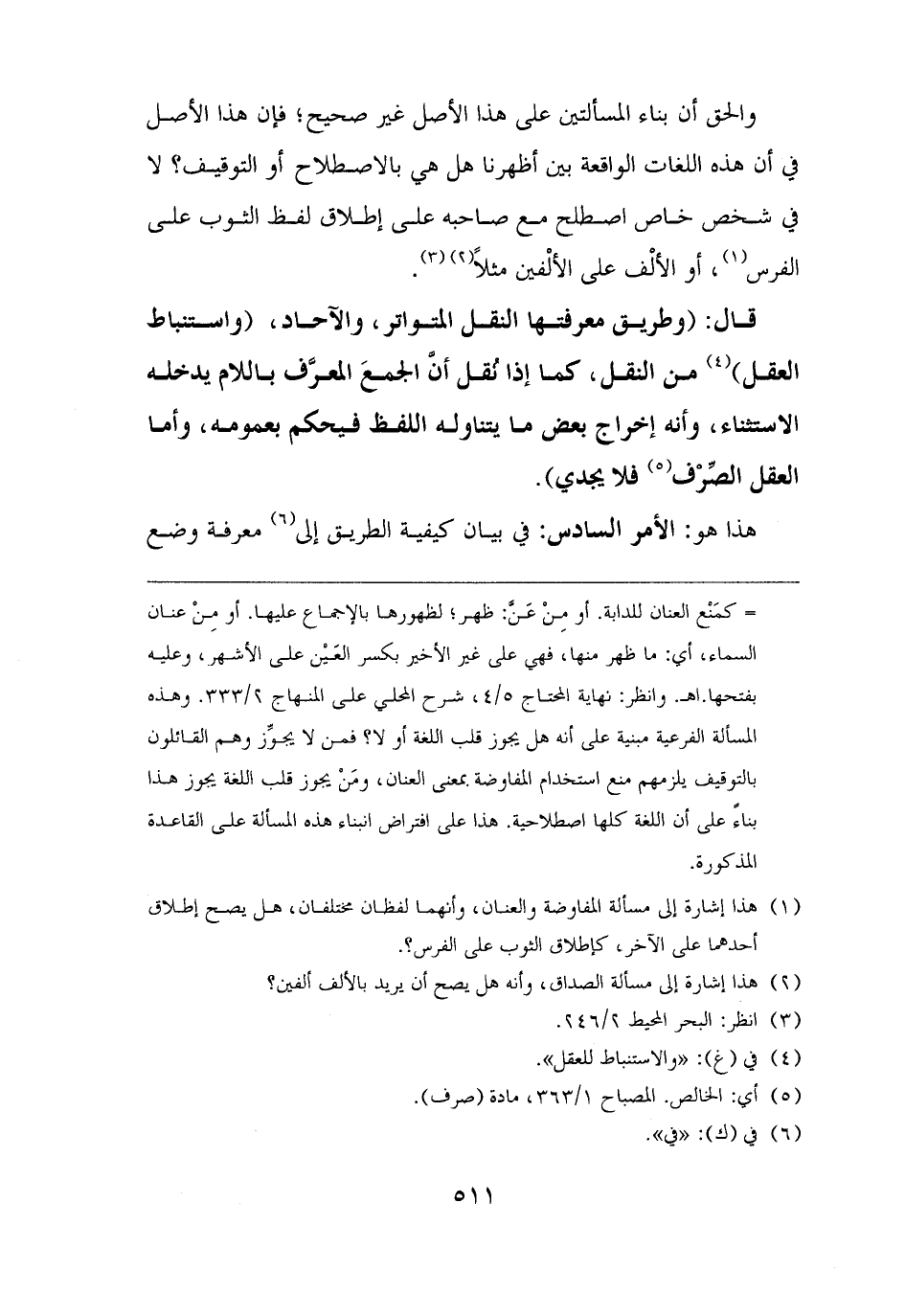 والحق أن بناء المسألتين على هذا الأصل غير صحيح؛ فإن هذا الأصل في أن هذه اللغات الواقعة بين أظهرنا هل هي بالاصطلاح أو التوقيف؟ لا في شخص خاص اصطلح مع صاحبه على إطلاق لفظ الثوب على الفرس (¬١)، أو الألْف على الألْفين مثلًا (¬٢) (¬٣).