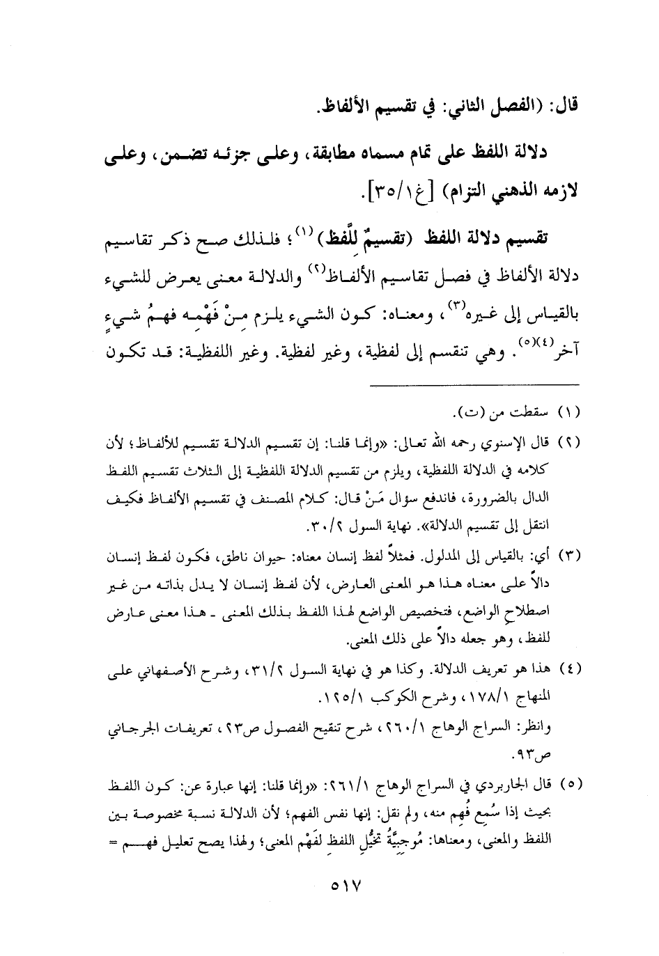 (¬٢) قال الإسنوي رحمه الله تعالى: "وإنما قلنا: إن تقسيم الدلالة تقسيم للألفاظ؛ لأن كلامه في الدلالة اللفظية، ويلزم من تقسيم الدلالة اللفظية إلى الثلاث تقسيم اللفظ الدال بالضرورة، فاندفع سؤال مَنْ قال: كلام المصنف في تقسيم الألفاظ فكيف انتقل إلى تقسيم الدلالة". نهاية السول ٢/ ٣٠.
