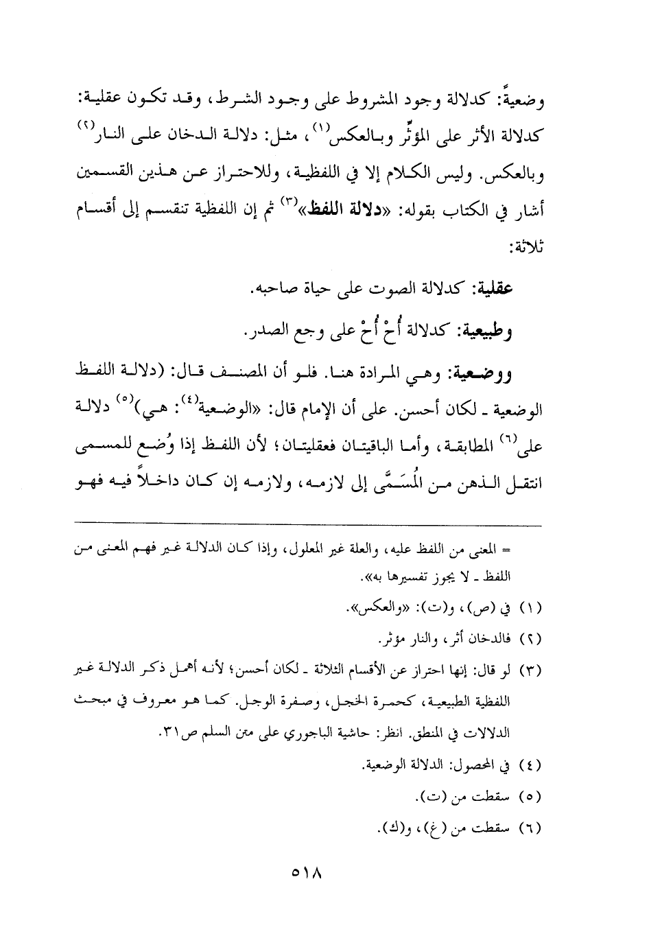 (¬٣) لو قال: إنها احتراز عن الأقسام الثلاثة - لكان أحسن؛ لأنه أهمل ذكر الدلالة غير اللفظية الطبيعية، كحمرة الخجل، وصفرة الوجل. كما هو معروف في مبحث الدلالات في المنطق. انظر: حاشية الباجوري على متن السلم ص ٣١.