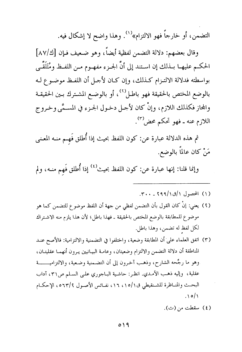 وقال بعضهم: دلالة التضمن لفظية أيضًا، وهو ضعيف فإن الحكم عليها بذلك إن استند إلى أنَّ الجزء مفهوم من اللفظ ومُتَلَقَّى بواسطته فدلالة الالتزام كذلك، وإن كان لأجل أن اللفظ موضوع له بالوضع المختص بالحقيقة فهو باطل (¬٢)، أو بالوضع المشترك بين الحقيقة والمجاز فكذلك اللازم، وإنْ كان لأجل دخول الجزء في المسمَّى وخروج اللازم عنه - فهو تحكم محض (¬٣).