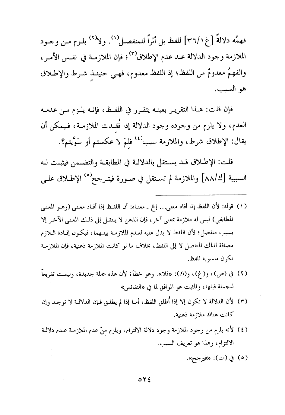 (¬٤) لأنه يلزم من وجود الملازمة وجود دلالة الالتزام، ويلزم مِنْ عدم الملازمة عدم دلالة الالتزام، وهذا هو تعريف السبب.