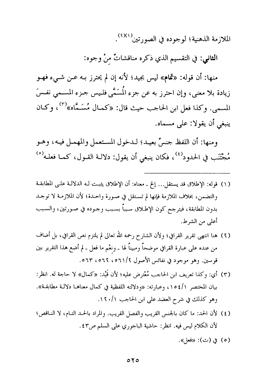 (¬٢) هنا انتهى تقرير القرافي؛ ولأن الشارح رحمه الله تعالى لم يلتزم نص القرافي، بل أضاف من عنده على عبارة القرافي موضحًا ومبينًا لها - ونِعْم ما فعل - لم أضع هذا التقرير بين قوسين. وهو موجود في نفائس الأصول ٢/ ٥٦١، ٥٦٢، ٥٦٣.