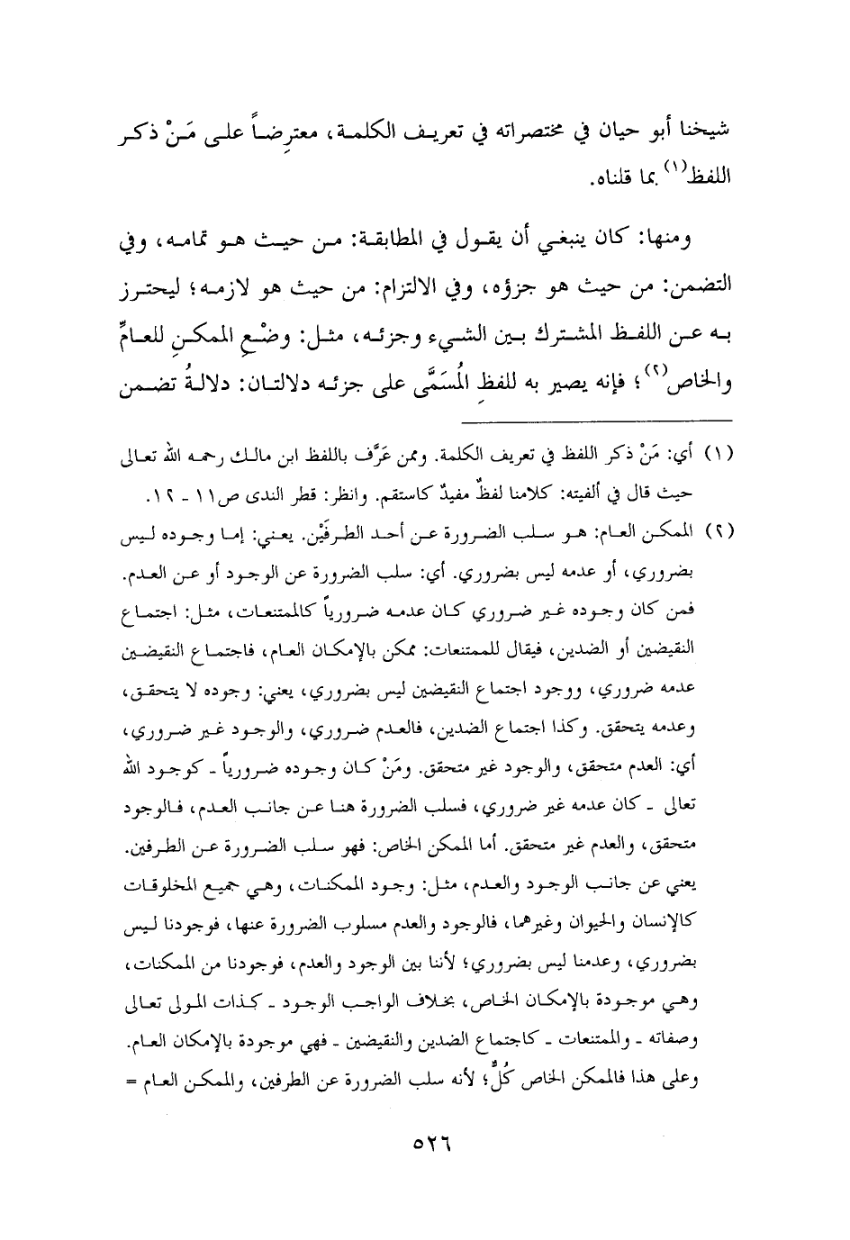 (¬٢) الممكن العام: هو سلب الضرورة عن أحد الطرفَيْن. يعني: إما وجوده ليس بضروري، أو عدمه ليس بضرورى. أي: سلب الضرورة عن الوجود أو عن العدم. فمن كان وجوده غير ضروري كان عدمه ضروريًا كالممتنعات، مثل: اجتماع النقيضين أو الضدين، فيقال للممتنعات: ممكن بالإمكان العام، فاجتماع النقيضين عدمه ضروري، ووجود اجتماع النقيضين ليس بضروري، يعني: وجوده لا يتحقق، وعدمه يتحقق. وكذا اجتماع الضدين، فالعدم ضروري، والوجود غير ضروري، أي: العدم متحقق، والوجود غير متحقق. ومَنْ كان وجوده ضروريًا - كوجود الله تعالى - كان عدمه غير ضروري، فسلب الضرورة هنا عن جانب العدم، فالوجود متحقق، والعدم غير متحقق. أما الممكن الخاص: فهو سلب الضرورة عن الطرفين. يعني عن جانب الوجود والعدم، مثل: وجود الممكنات، وهى جميع المخلوقات كالإنسان والحيوان وغيرهما، فالوجود والعدم مسلوب الضرورة عنها، فوجودنا ليس بضروري، وعدمنا ليس بضروري؛ لأننا بين الوجود والعدم، فوجودنا من الممكنات، وهي موجودة بالإمكان الخاص، بخلاف الواجب الوجود - كذات المولى تعالى وصفاته - والممتنعات - كاجتماع الضدين والنقيضين - فهي موجودة بالإمكان العام. وعلى هذا فالممكن الخاص كُلٌّ؛ لأنه سلب الضرورة عن الطرفين، والممكن العام =