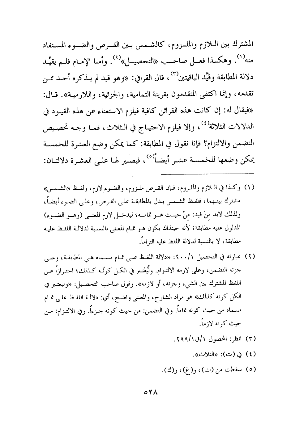 المشترك بين اللازم والملزوم، كالشمس بين القرص والضوء المستفاد منه (¬١). وهكذا فعل صاحب "التحصيل" (¬٢). وأما الإمام فلم يقيِّد دلالة المطابقة وقيَّد الباقيتين (¬٣)، قال القرافي: "وهو قيد لم يذكره أحد ممن تقدمه، وإنما اكتفى المتقدمون بقرينة التمامية، والجزئية، واللازمية". قال: "فيقال له: إن كانت هذه القرائن كافية فيلزم الاستغناء عن هذه القيود في الدلالات الثلاثة (¬٤)، وإلا فيلزم الاحتياج في الثلاث، فما وجه تخصيص التضمن والالتزام؟ فإنا نقول في المطابقة: كما يمكن وضع العشرة للخمسة يمكن وضعها للخمسة عشر أيضًا (¬٥)، فيصير لها على العشرة دلالتان: