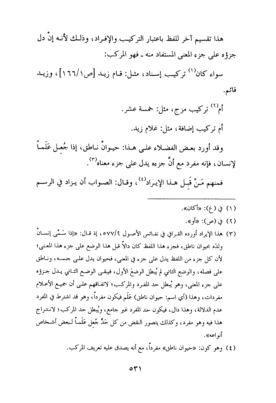 (¬٣) هذا الإيراد أورده القرافي في نفائس الأصول ٢/ ٥٧٧، إذ قال: "إذا سَمَّى إنسانٌ ولدَه بحيوان ناطق، فجزء هذا اللفظ كان دالًا قبل هذا الوضع على جزء هذا المعنى؛ لأن كل جزء من اللفظ يدل على جزء في المعنى، فحيوان يدل على جنسه، وناطق على فصله، والوضع الثاني لم يُبطل الوضعَ الأول، فيبقى الوضع الثاني يدل جزؤه على جزء المعنى، وهو يُبطل حد المفرد والمركب؛ لاتفاقهم على أن جميع الأعلام مفردات، وهذا (أي اسم: حيوان ناطق) عَلَم فيكون مفردًا، وهو قد اشترط في المفرد عدم الدلالة، وهذا دال، فيكون حد المفرد غير جامع، ويُبطل حد المركب؛ لاندراج هذا فيه وهو مفرد، وكذلك يتصور النقض من كل حَدٍّ جُعِل عَلَمًا لبعض أشخاص أنواعه".