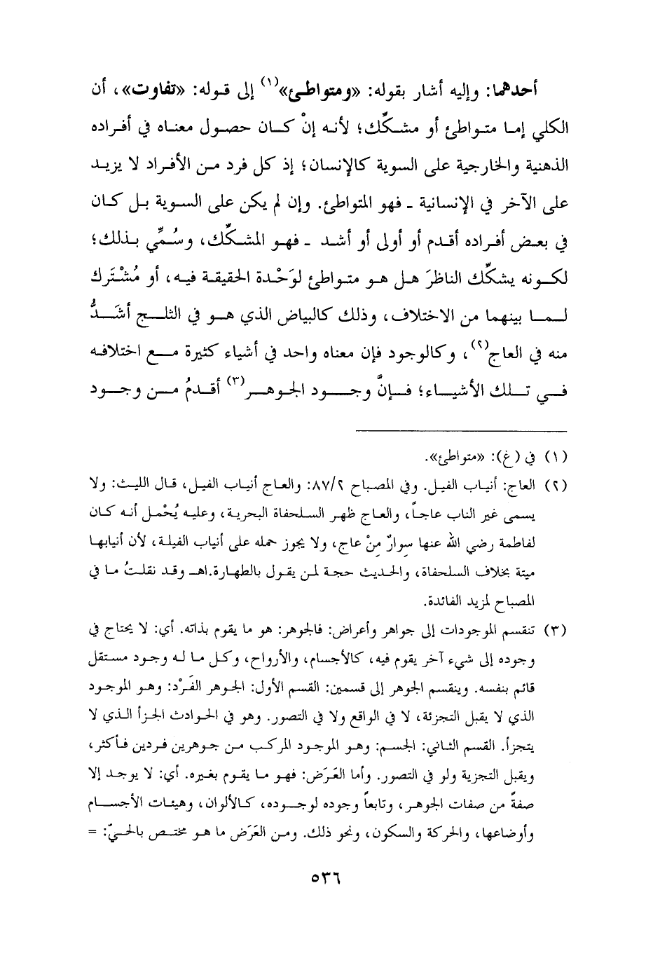 أحدهما: وإليه أشار بقوله: "ومتواطئ" (¬١) إلى قوله: "تفاوت"، أن الكلي إما متواطئ أو مشكِّك؛ لأنه إنْ كان حصول معناه في أفراده الذهنية والخارجية على السوية كالإنسان؛ إذ كل فرد من الأفراد لا يزيد على الآخر في الإنسانية - فهو المتواطئ. وإن لم يكن على السوية بل كان في بعض أفراده أقدم أو أولى أو أشد - فهو المشكِّك، وسُمِّي بذلك؛ لكونه يشكِّك الناظرَ هل هو متواطئ لوَحْدة الحقيقة فيه، أو مُشْتَرك لما بينهما من الاختلاف، وذلك كالبياض الذي هو في الثلج أشَدُّ منه في العاج (¬٢)، وكالوجود فإن معناه واحد في أشياء كثيرة مع اختلافه في تلك الأشياء؛ فإنَّ وجود الجوهر (¬٣) أقدمُ من وجود