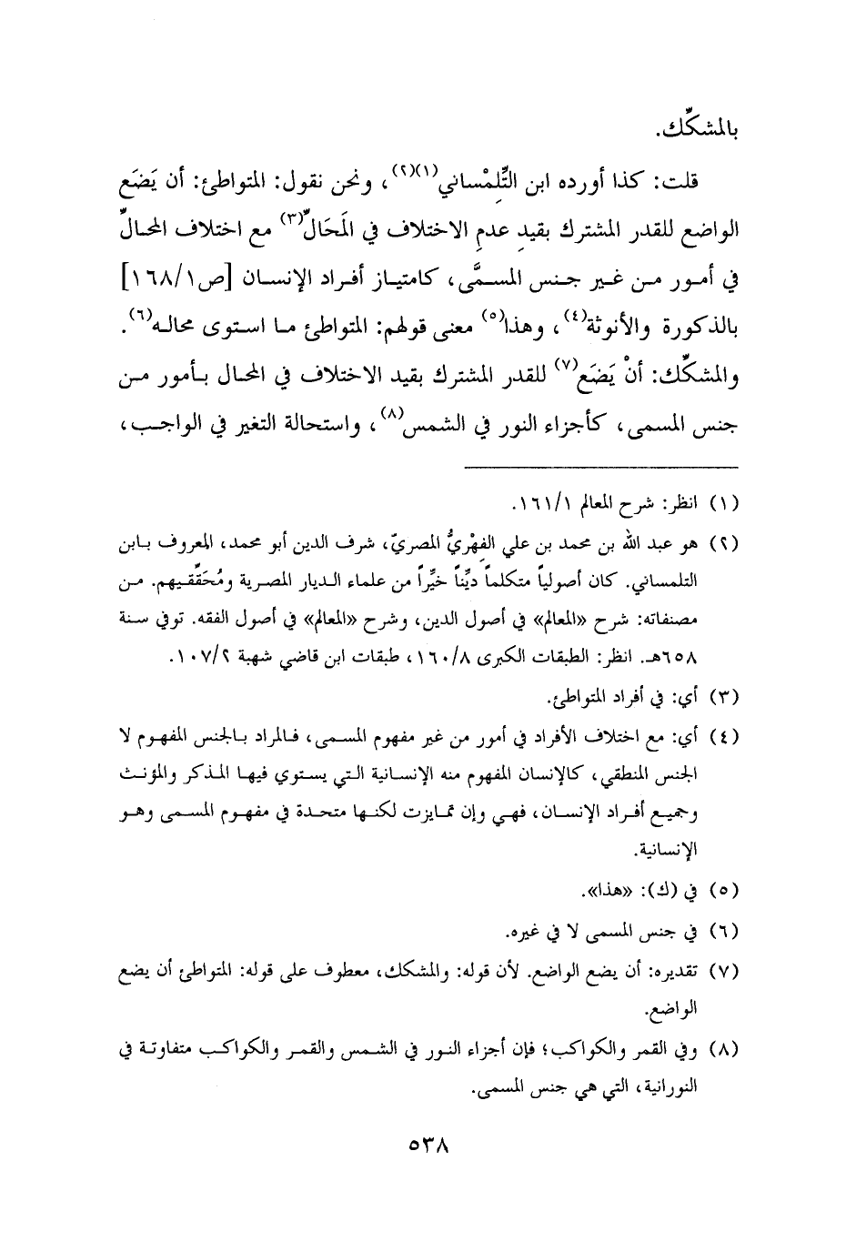 قلت: كذا أورده ابن التِّلِمْساني (¬١) (¬٢)، ونحن نقول: المتواطئ: أن يَضَع الواضع للقدر المشترك بقيدِ عدمِ الاختلاف في المَحَالِّ (¬٣) مع اختلاف المحالِّ في أمور من غير جنس المسمَّى، كامتياز أفراد الإنسان بالذكورة والأنوثة (¬٤)، وهذا (¬٥) معنى قولهم: المتواطئ ما استوى محاله (¬٦). والمشكِّك: أنْ يَضَع (¬٧) للقدر المشترك بقيد الاختلاف في المحال بأمور من جنس المسمى، كأجزاء النور في الشمس (¬٨)، واستحالة التغير في الواجب،