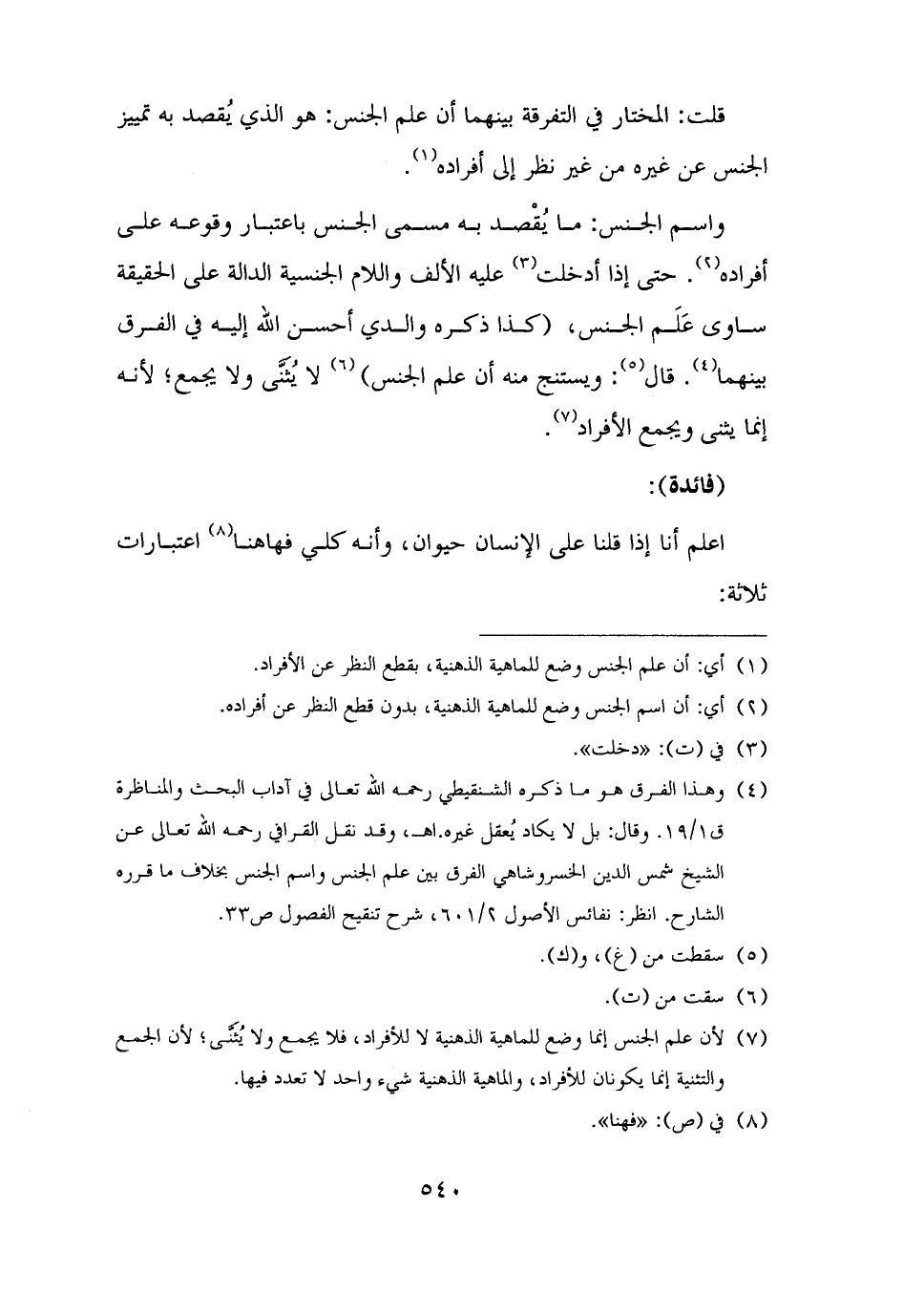 (¬٤) وهذا الفرق هو ما ذكره الشنقيطي رحمه الله تعالى في آداب البحث والمناظرة ق ١/ ١٩. وقال: بل لا يكاد يُعقل غيره. اهـ، وقد نقل القرافي رحمه الله تعالى عن الشيخ شمس الدين الخسروشاهي الفرق بين علم الجنس واسم الجنس بخلاف ما قرره الشارح. انظر: نفائس الأصول ٢/ ٦٠١، شرح تنقيح الفصول ص ٣٣.