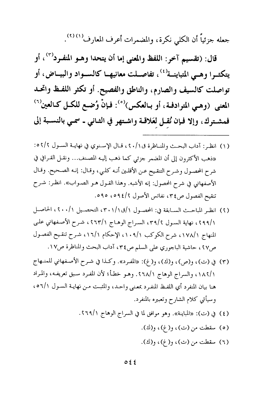 (¬٢) انظر المباحث السابقة في: المحصول ١/ ق ١/ ٣٠١، التحصيل ١/ ٢٠٠، الحاصل ١/ ٢٩٩، نهاية السول ٢/ ٣٩، السراج الوهاج ١/ ٢٦٣، شرح الأصفهاني على المنهاج ١/ ١٧٨، شرح الكوكب ١/ ١٠٩، الإحكام ١/ ١٦، شرح تنقيح الفصول ص ٢٧، حاشية الباجوري على السلم ص ٣٤، آداب البحث والمناظرة ص ١٧.