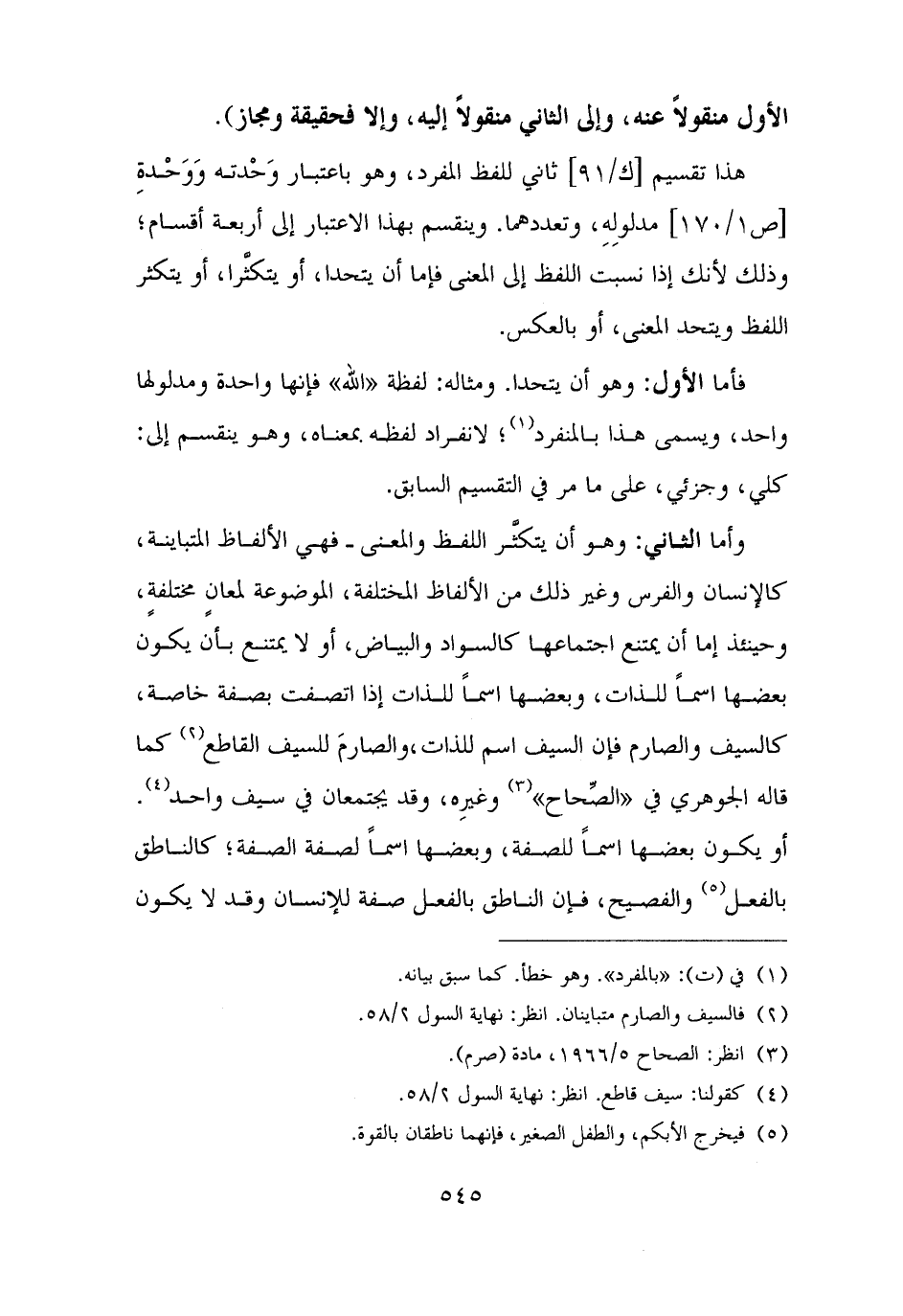 وأما الثاني: وهو أن يتكثَّر اللفظ والمعنى - فهي الألفاظ المتباينة، كالإنسان والفرس وغير ذلك من الألفاظ المختلفة، الموضوعة لمعانٍ مختلفةٍ، وحينئذ إما أن يمتنع اجتماعها كالسواد والبياض، أو لا يمتنع بأن يكون بعضها اسمًا للذات، وبعضها اسمًا للذات إذا اتصفت بصفة خاصة، كالسيف والصارم فإن السيف اسم للذات، والصارمَ للسيف القاطع (¬٢) كما قاله الجوهري في "الصِّحاح" (¬٣) وغيرِه، وقد يجتمعان في سيف واحد (¬٤). أو يكون بعضها اسمًا للصفة، وبعضها اسمًا لصفة الصفة؛ كالناطق بالفعل (¬٥) والفصيح، فإن الناطق بالفعل صفة للإنسان وقد لا يكون