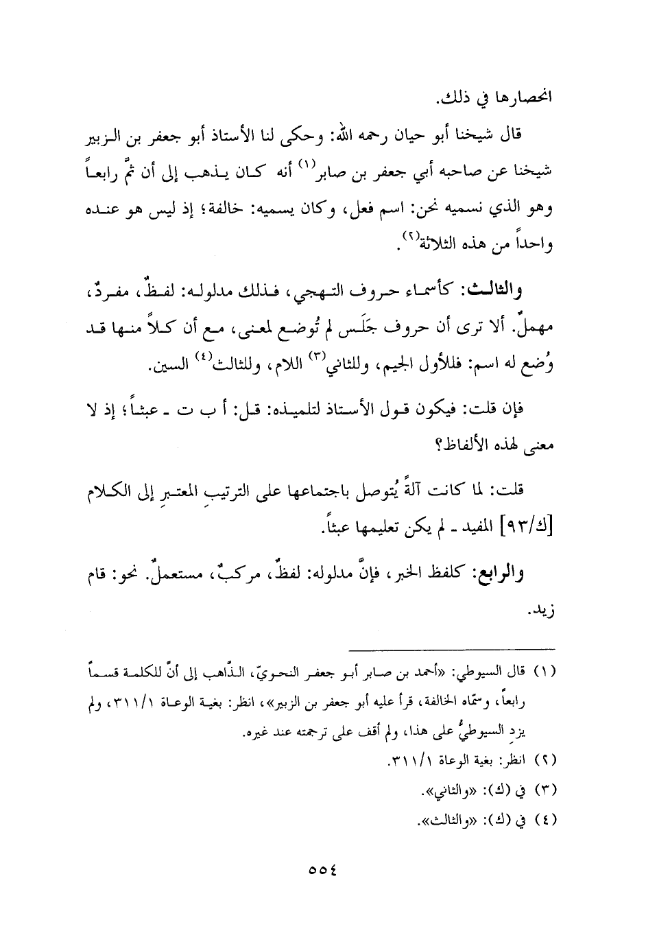 (¬١) قال السيوطي: "أحمد بن صابر أبو جعفر النحويّ، الذَّاهب إلى أنَّ للكلمة قسمًا رابعًا، وسمّاه الخالفة، قرأ عليه أبو جعفر بن الزبير"، انظر: بغية الوعاة ١/ ٣١١، ولم يزدِ السيوطيُّ على هذا، ولم أقف على ترجمته عند غيره.