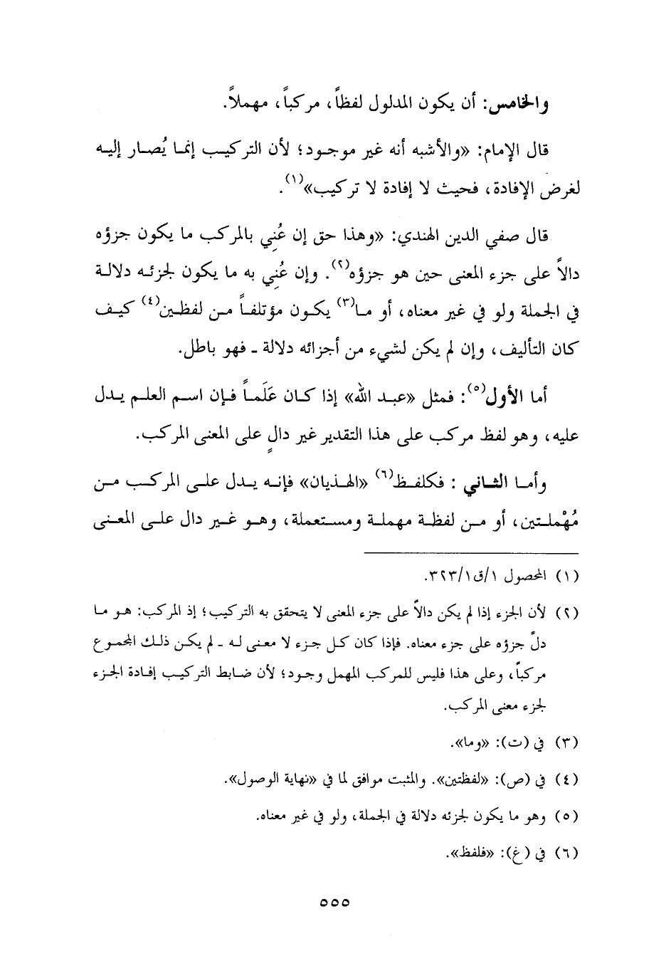 قال صفي الدين الهندي: "وهذا حق إن عُنِي بالمركب ما يكون جزؤه دالًا على جزء المعنى حين هو جزؤه (¬٢). وإن عُنِي به ما يكون لجزئه دلالة في الجملة ولو في غير معناه، أو ما (¬٣) يكون مؤتلفًا من لفظين (¬٤) كيف كان التأليف، وإن لم يكن لشيء من أجزائه دلالة - فهو باطل.