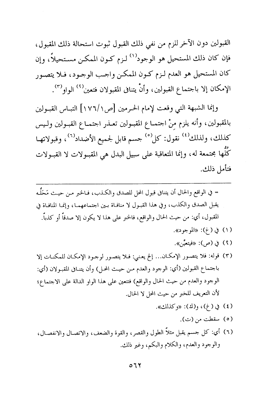 القبولين دون الآخر للزم من نفي ذلك القبول ثبوت استحالة ذلك المقبول، فإن كان ذلك المستحيل هو الوجود (¬١) لزم كون الممكن مستحيلًا، وإن كان المستحيل هو العدم لزم كون الممكن واجب الوجود، فلا يتصور الإمكان إلا باجتماع القبولين، وأنْ يتنافى المقبولان فتعين (¬٢) الواو (¬٣).