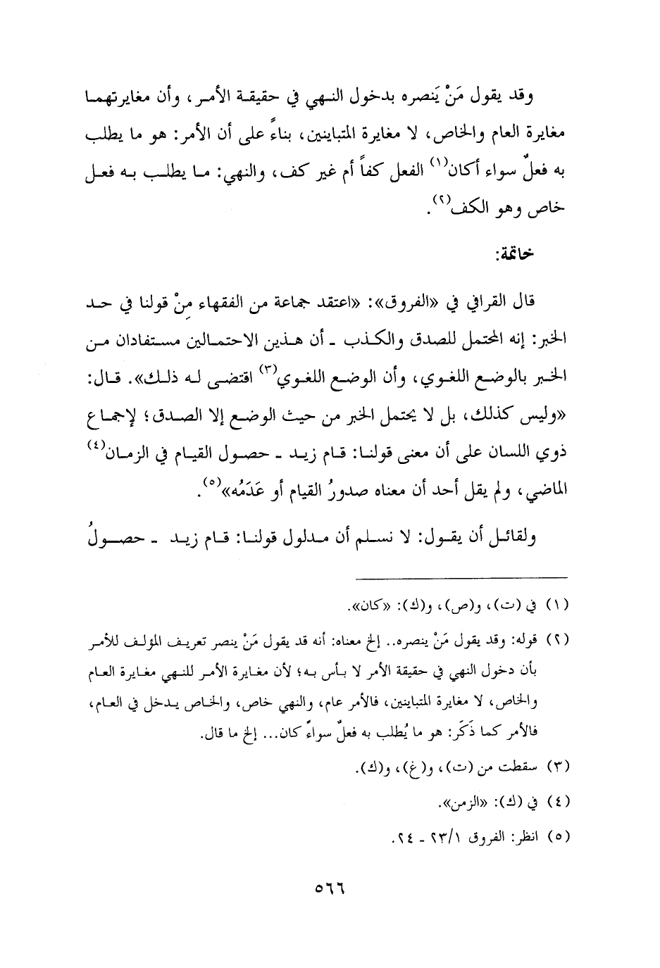 قال القرافي في "الفروق": "اعتقد جماعة من الفقهاء مِنْ قولنا في حد الخبر: إنه المحتمل للصدق والكذب - أن هذين الاحتمالين مستفادان من الخبر بالوضع اللغوي، وأن الوضع اللغوي (¬٣) اقتضى له ذلك". قال: "وليس كذلك، بل لا يحتمل الخبر من حيث الوضع إلا الصدق؛ لإجماع ذوي اللسان على أن معنى قولنا: قام زيد - حصول القيام في الزمان (¬٤) الماضي، ولم يقل أحد أن معناه صدورُ القيام أو عَدَمُه" (¬٥).