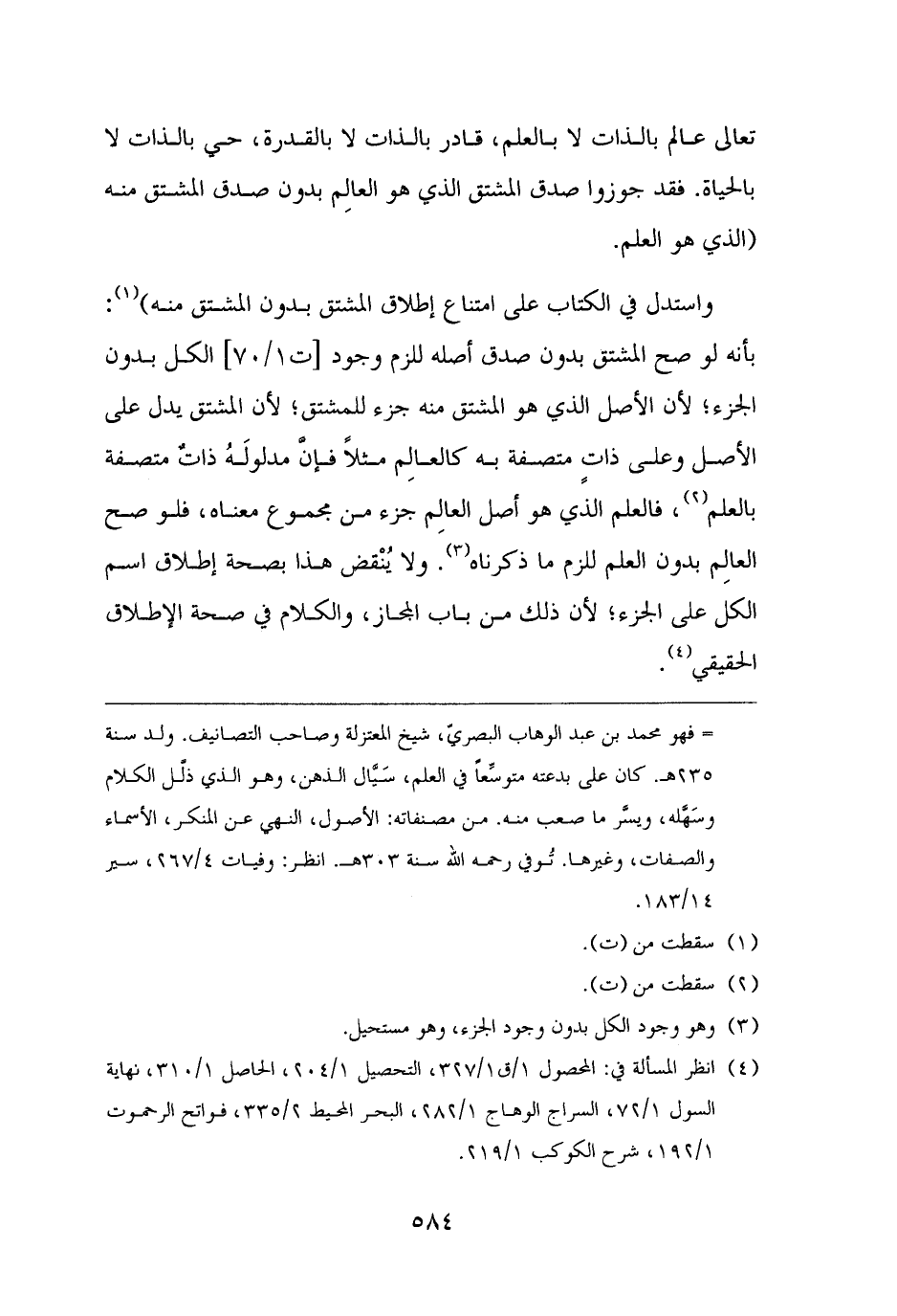 تعالى عالم بالذات لا بالعلم، قادر بالذات لا بالقدرة، حي بالذات لا بالحياة. فقد جوزوا صدق المشتق الذي هو العالِم بدون صدق المشتق منه (الذي هو العلم.