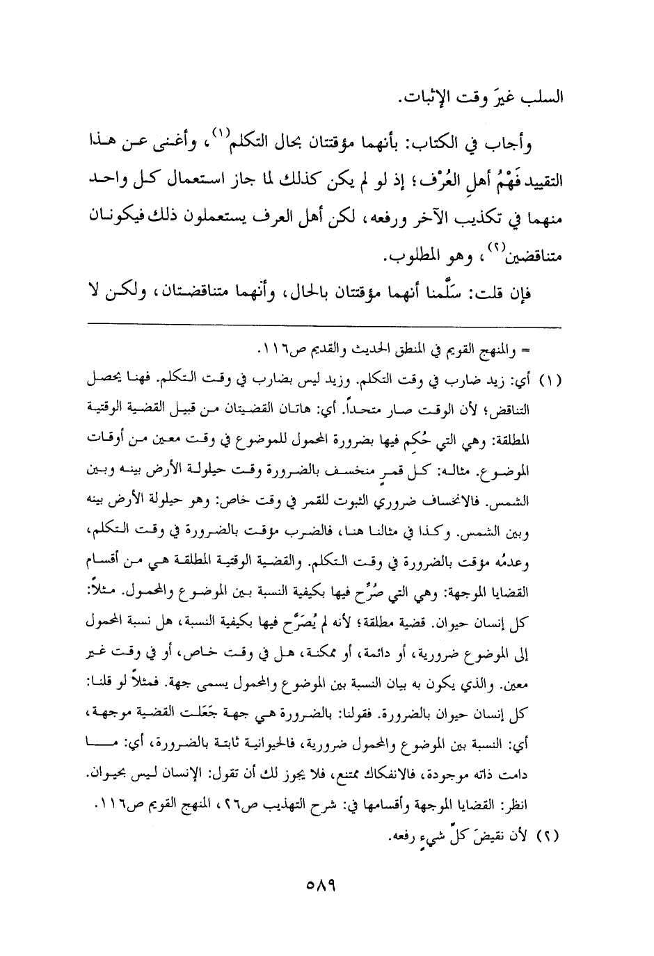 (¬١) أي: زيد ضارب في وقت التكلم. وزيد ليس بضارب في وقت التكلم. فهنا يحصل التناقض؛ لأن الوقت صار متحدًا. أي: هاتان القضيتان من قبيل القضية الوقتية المطلقة: وهي التي حُكِم فيها بضرورة المحمول للموضوع في وقت معين من أوقات الموضوع. مثاله: كل قمرٍ منخسف بالضرورة وقت حيلولة الأرض بينه وبين الشمس. فالانخساف ضروري الثبوت للقمر في وقت خاص: وهو حيلولة الأرض بينه وبين الشمس. وكذا في مثالنا هنا، فالضرب موقت بالضرورة في وقت التكلم، وعدمُه مؤقت بالضرورة في وقت التكلم. والقضية الوقتية المطلقة هي من أقسام القضايا الموجهة: وهي التي صُرِّح فيها بكيفية النسبة بين الموضوع والمحمول. مثلًا: كل إنسان حيوان. قضية مطلقة؛ لأنه لم يُصَرَّح فيها بكيفية النسبة، هل نسبة المحمول إلى الموضوع ضرورية، أو دائمة، أو ممكنة، هل في وقت خاص، أو في وقت غير معين. والذي يكون به بيان النسبة بين الموضوع والمحمول يسمى جهة. فمثلًا لو قلنا: كل إنسان حيوان بالضرورة. فقولنا: بالضرورة هي جهة جَعَلت القضية موجهة، أي: النسبة بين الموضوع والمحمول ضرورية، فالحيوانية ثابتة بالضرورة، أي: ما دامت ذاته موجودة، فالانفكاك ممتنع، فلا يجوز لك أن تقول: الإنسان ليس بحيوان. انظر: القضايا الموجهة وأقسامها في: شرح التهذيب ص ٢٦، المنهج القويم ص ١١٦.