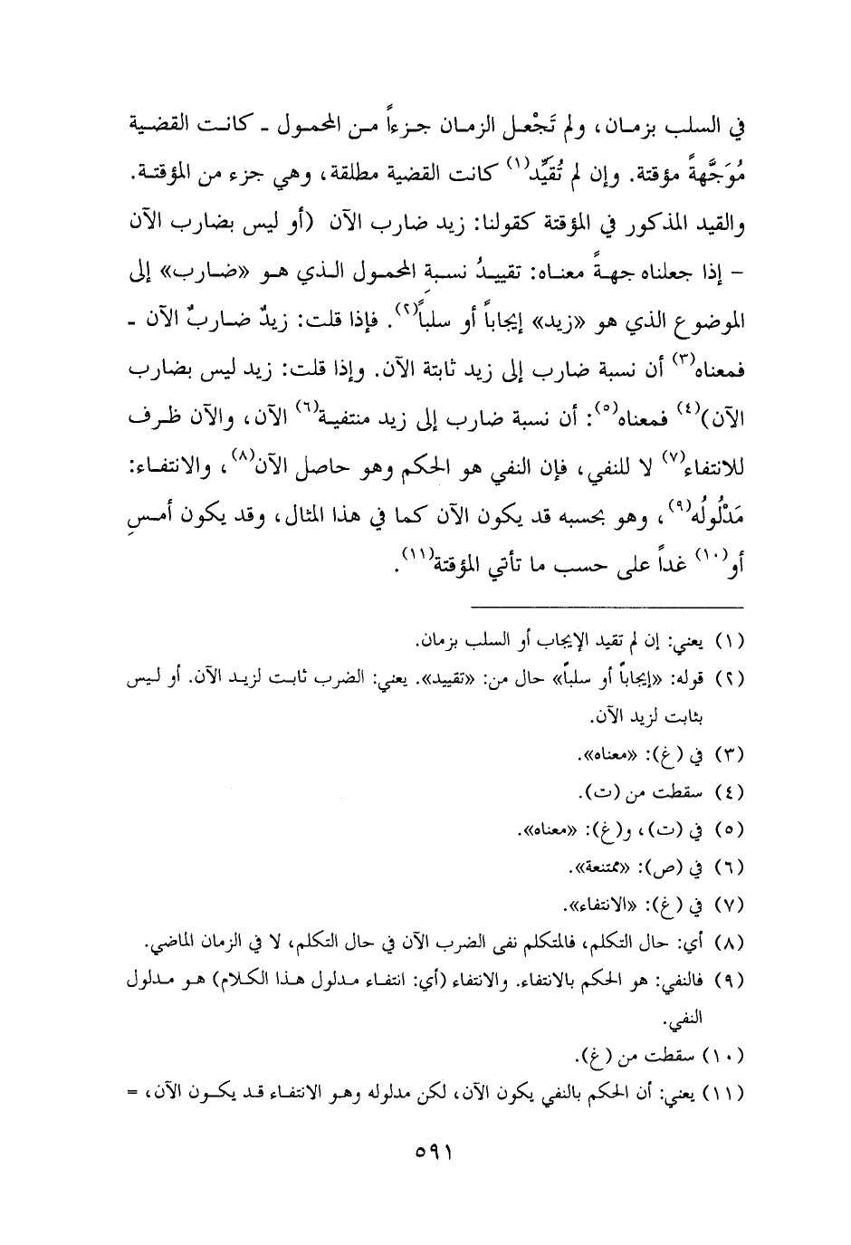 في السلب بزمان، ولم تَجْعل الزمان جزءًا من المحمول - كانت القضية مُوَجَّهةً مؤقتة. وإن لم تُقَيِّد (¬١) كانت القضية مطلقة، وهي جزء من المؤقتة. والقيد المذكور في المؤقتة كقولنا: زيد ضارب الآن (أو ليس بضارب الآن - إذا جعلناه جهةً معناه: تقييدُ نسبةِ المحمول الذي هو "ضارب" إلى الموضوع الذي هو "زيد" إيجابًا أو سلبًا (¬٢). فإذا قلت: زيدٌ ضاربٌ الآن - فمعناه (¬٣) أن نسبة ضارب إلى زيد ثابتة الآن. وإذا قلت: زيد ليس بضارب الآن) (¬٤) فمعناه (¬٥): أن نسبة ضارب إلى زيد منتفية (¬٦) الآن، والآن ظرف للانتفاء (¬٧) لا للنفي، فإن النفي هو الحكم وهو حاصل الآن (¬٨)، والانتفاء: مَدْلُولُه (¬٩)، وهو بحسبه قد يكون الآن كما في هذا المثال، وقد يكون أمسِ أو (¬١٠) غدًا على حسب ما تأتي المؤقتة (¬١١).
