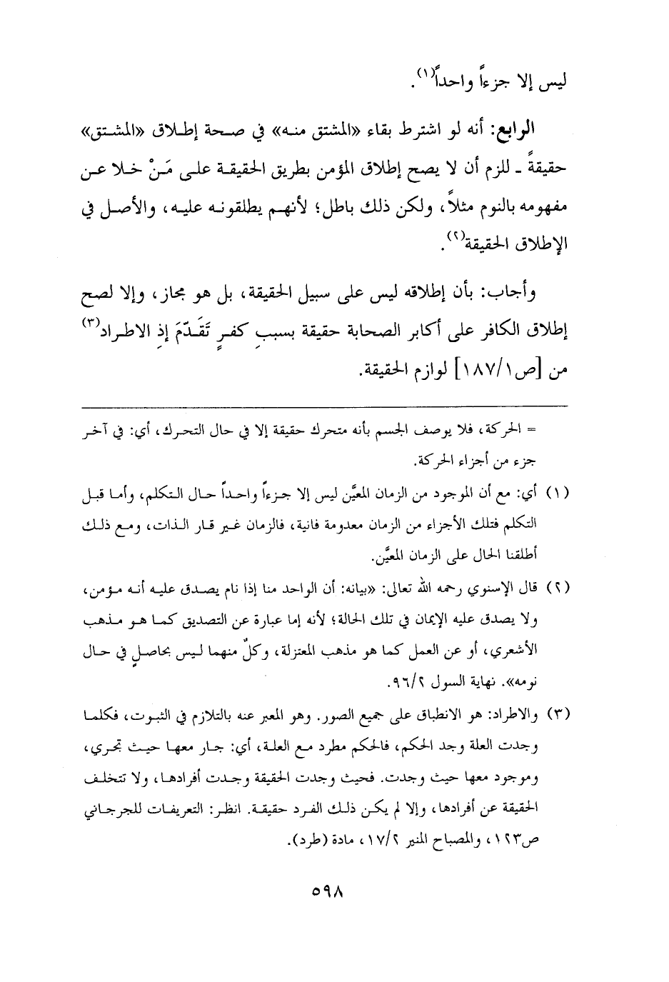 (¬٣) والاطراد: هو الانطباق على جميع الصور. وهو المعبر عنه بالتلازم في الثبوت، فكلما وجدت العلة وجد الحكم، فالحكم مطرد مع العلة، أي: جار معها حيث تجري، وموجود معها حيث وجدت. فحيث وجدت الحقيقة وجدت أفرادها، ولا تتخلف الحقيقة عن أفرادها، وإلا لم يكن ذلك الفرد حقيقة. انظر: التعريفات للجرجاني ص ١٢٣، والمصباح المنير ٢/ ١٧، مادة (طرد).