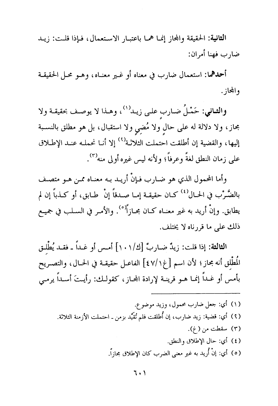 وأما المحمول الذي هو ضارب فإنْ أريد به معناه ممن هو متصف بالضَّرْب في الحال (¬٤) كان حقيقة إما صدقًا إنْ طابق، أو كذبًا إن لم يطابق. وإنْ أريد به غير معناه كان مجازًا (¬٥). والأمر في السلب في جميع ذلك على ما قررناه لا يختلف.