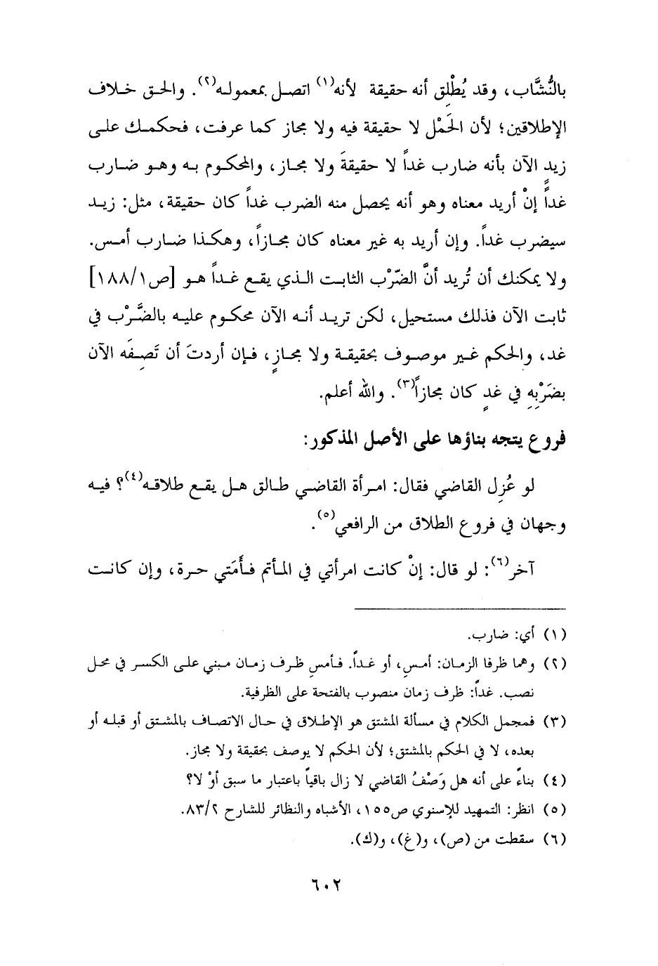 بالنُّشَّاب، وقد يُطْلِق أنه حقيقة لأنه (¬١) اتصل بمعموله (¬٢). والحق خلاف الإطلاقين؛ لأن الحَمْل لا حقيقة فيه ولا مجاز كما عرفت، فحكمك على زيدٍ الآن بأنه ضارب غدًا لا حقيقةَ ولا مجاز، والمحكوم به وهو ضارب غدًا إنْ أريد معناه وهو أنه يحصل منه الضرب غدًا كان حقيقة، مثل: زيد سيضرب غدًا. وإن أريد به غير معناه كان مجازًا، وهكذا ضارب أمس. ولا يمكنك أن تُريد أن الضَّرْب الثابت الذي يقع غدًا هو [ص ١/ ١٨٨] ثابت الآن فذلك مستحيل، لكن تريد أنه الآن محكوم عليه بالضَّرْب في غد، والحكم غير موصوف بحقيقة ولا مجازٍ، فإن أردتَ أن تَصِفَه الآن بضَرْبِهِ في غدٍ كان مجازًا (¬٣). والله أعلم.